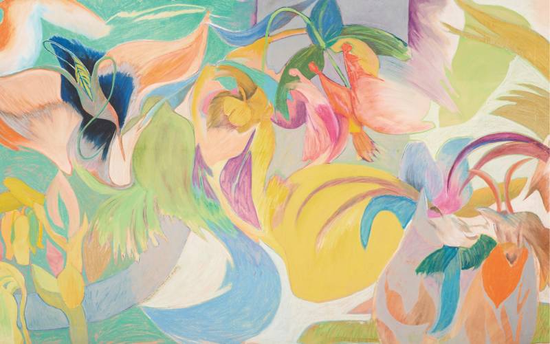 ‘몽그랑레시’와 ‘취약할 의향’ 등과 연계된 이미지와 내용을 다층적으로 콜라주해 사변적 소우주처럼 재구성하는 벨벳 평면 연작 중 ‘무제(취약할 의향-벨벳 #15)’(2021).
