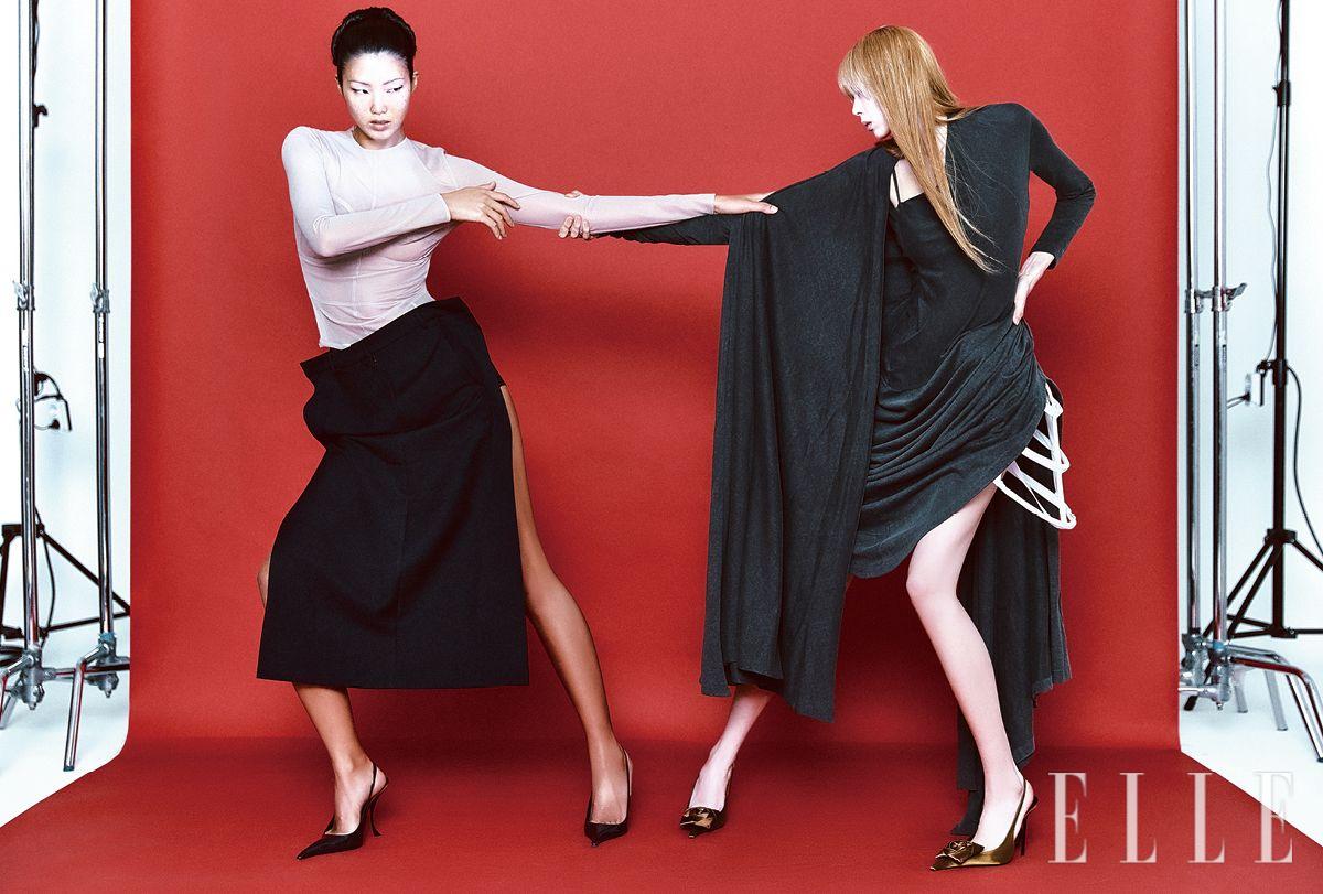 한나가 입은 메시 톱은 44만5천원, 스퀘어 스커트는 67만2천원, 모두 Pushbutton. 스틸레토 힐은 가격 미정, Saint Laurent by Anthony Vaccarello. 아라가 입은 언밸런스 드레스는 1백44만원대, Pushbutton. 장미 코르사주 장식의 스틸레토 힐은 가격 미정, Saint Laurent by Anthony Vaccarello. 페티코트는 에디터 소장품.