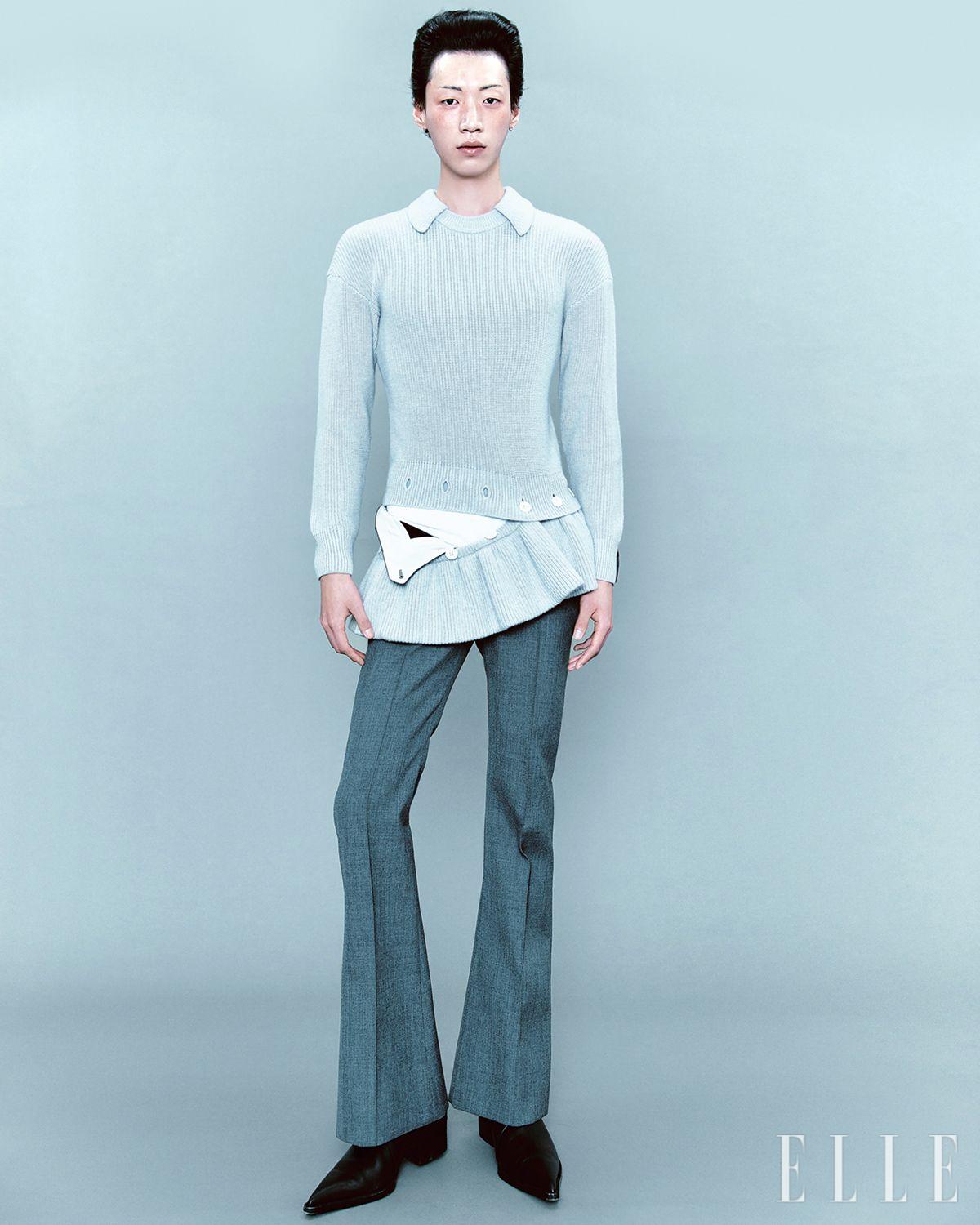 니트는 90만원, 플레어 팬츠는 79만원, 모두 Rokh. 스틸레토 부츠는 가격 미정, McQueen.