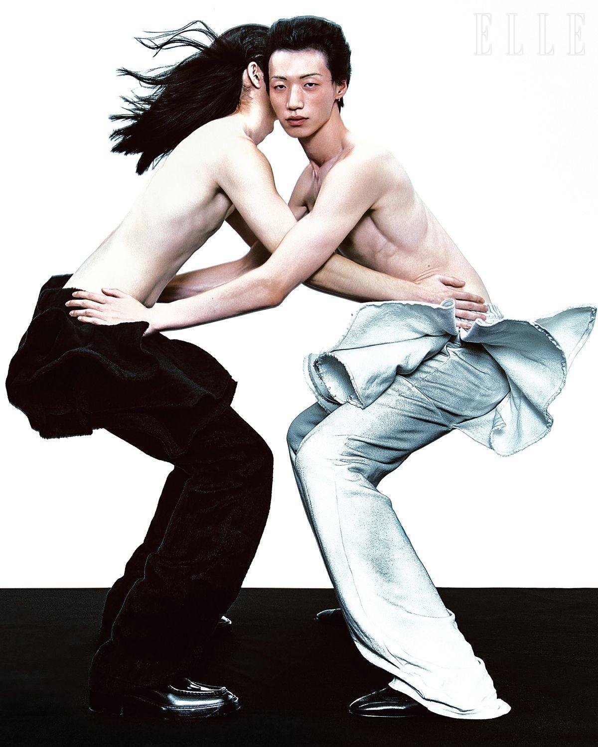 유엔신이 입은 데님 프릴 원피스는 2백98만원, Miss Gee Collection. 스틸레토 힐은 가격 미정, Jimmy Choo. 승민이 입은 블랙 톱과 팬츠는 가격 미정, 모두 Andy & Debb. 로퍼는 가격 미정, Celine. 스타킹과 삭스는 모두 에디터 소장품.