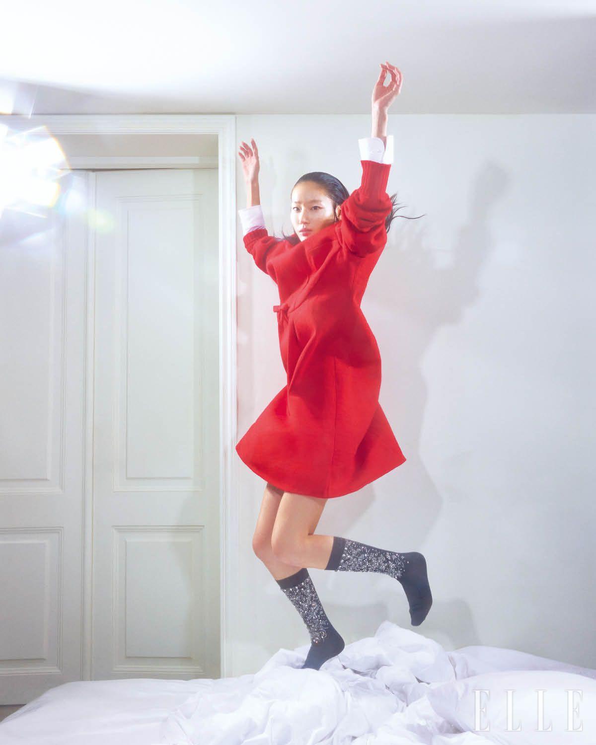 레드 니트 드레스와 셔츠는 가격 미정, 모두 Prada. 크리스털 장식의 양말은 가격 미정, Miu Miu.