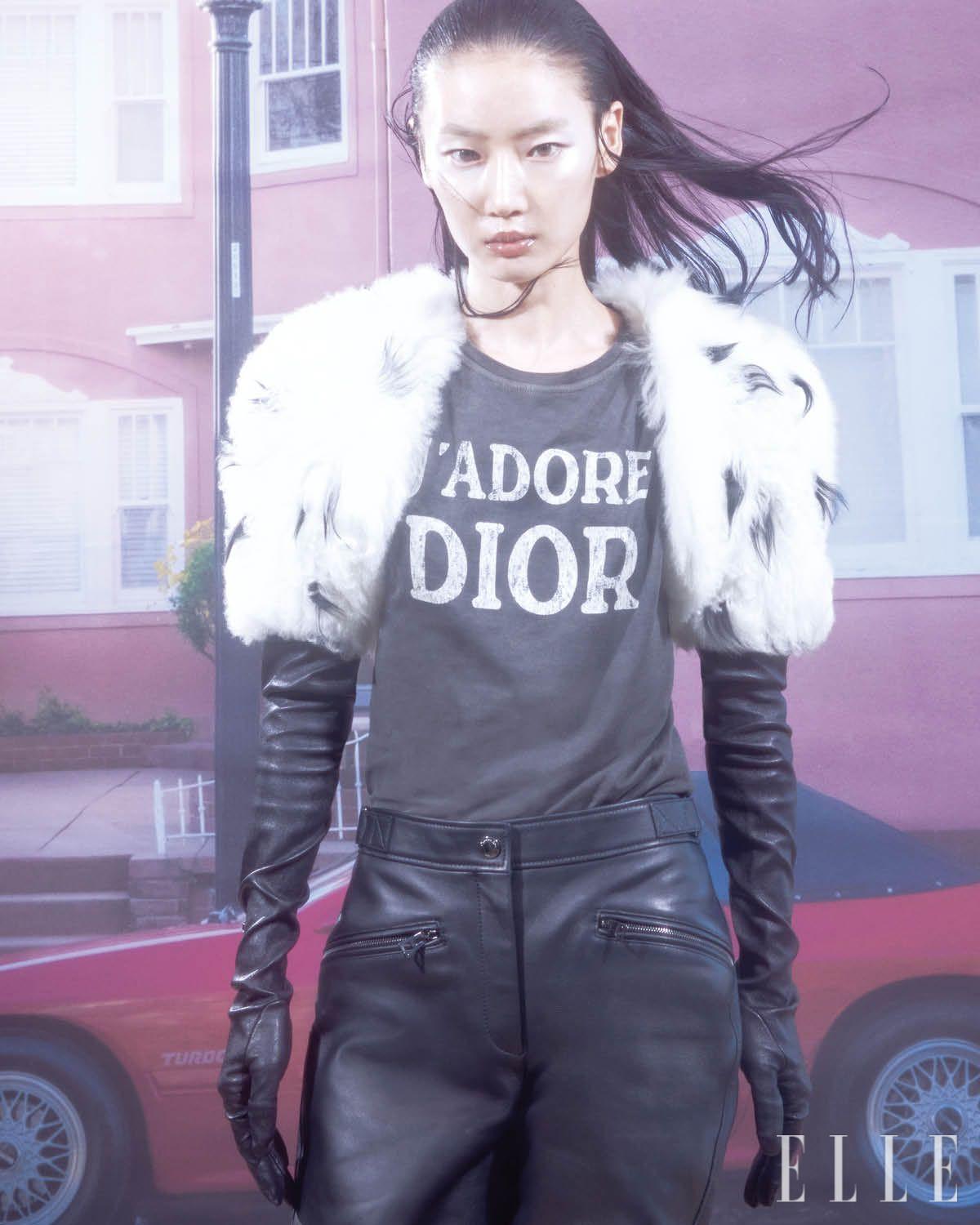 레더 글러브가 부착된 크롭트 퍼 재킷과 레터링 탱크톱, 레더 팬츠는 가격 미정, 모두 Dior.