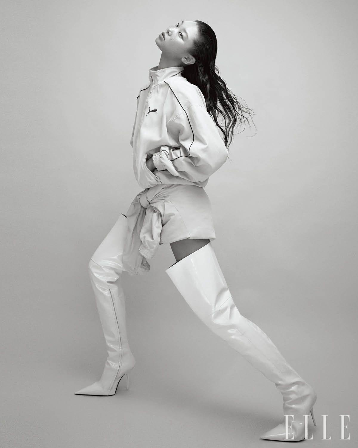 트랙 수트 재킷과 스커트, 화이트 사이하이 부츠는 가격 미정, 모두 Balenciaga.