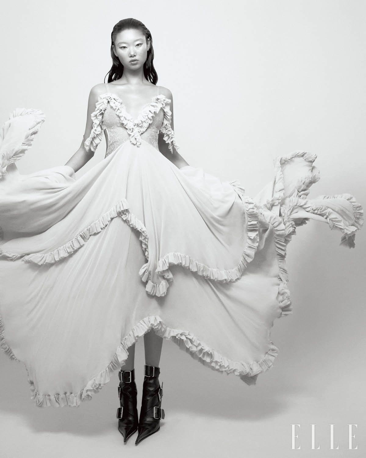 러플 장식의 시어 드레스와 버클 디테일의 앵클부츠는 가격 미정, 모두 McQueen.