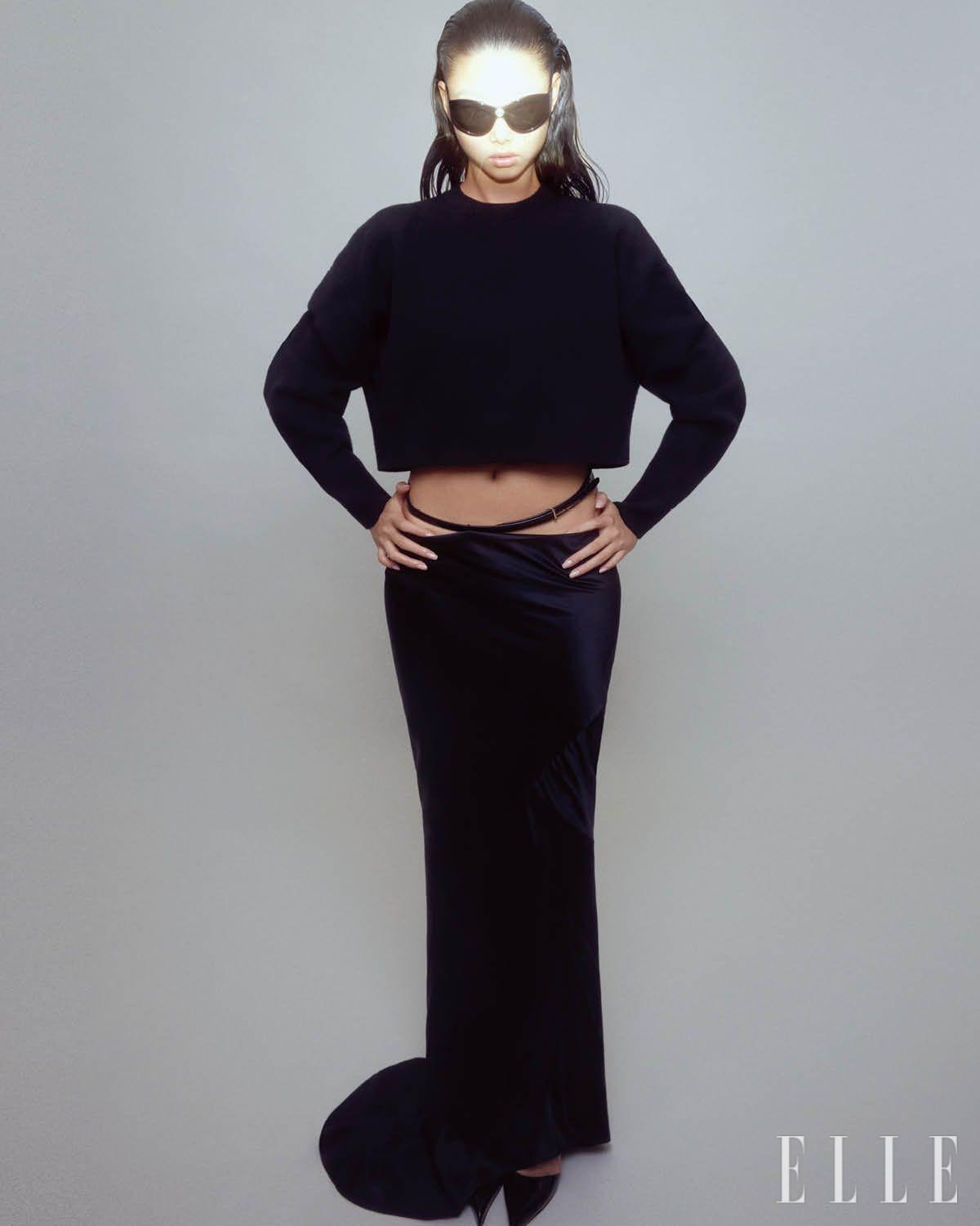 크롭트 니트 톱과 실크 스커트, 벨트, 펌프스는 가격 미정, 모두 Tom Ford. 크리스털 장식의 선글라스는 가격 미정, Saint Laurent by Anthony Vaccarello.