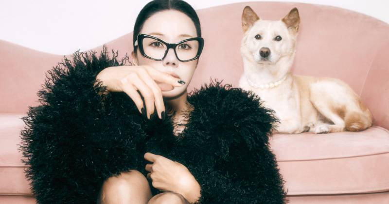 체크무늬 코트와 니트, 팬츠, 안경과 사이하이 부츠는 모두 Saint Laurent by Anthony Vaccarello.