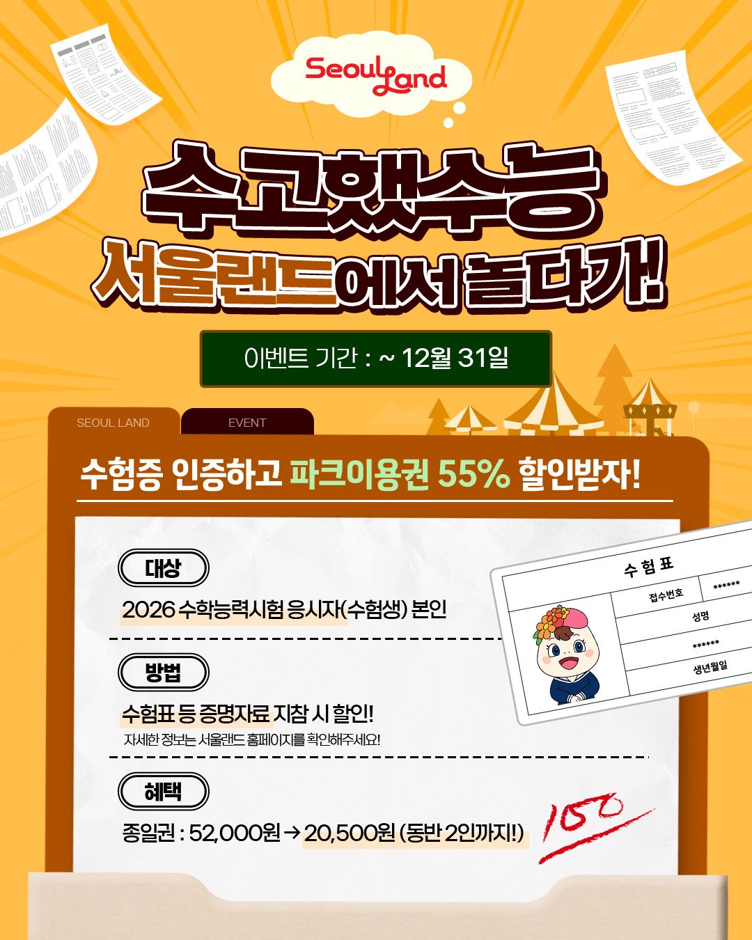 수험 스트레스 해소에 테마파크만한 게 없죠. 에버랜드는 수험생 본인에 한해 연말까지 종일 이용권을 2만원에 판매합니다. 여기에, 본인 제외 최대 3인까지 종일 이용권을 3만원에 구입할 수 있는 만큼 단체 방문 수요가 높아질 것으로 예상돼요.