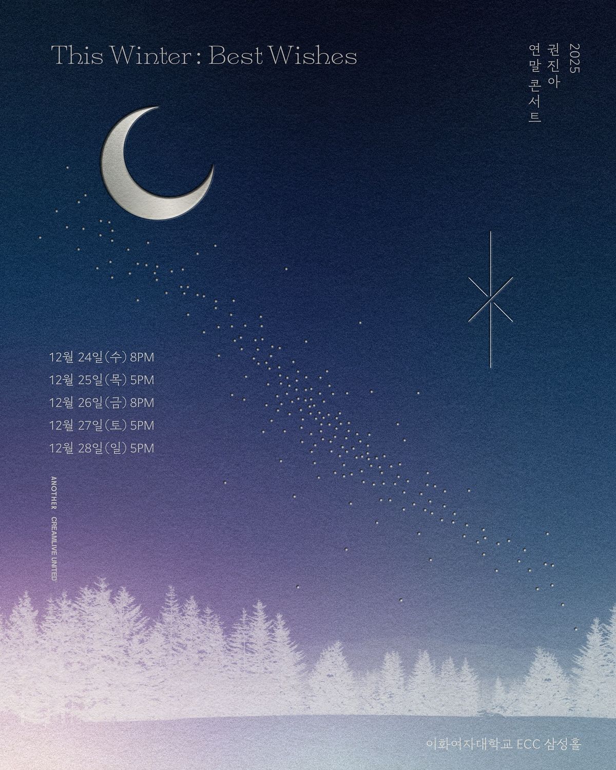 겨울과 가장 잘 어울리는 목소리 권진아가 연말 감성을 담은 공연 ‘This Winter : Best Wishes’로 찾아옵니다. 자신의 이야기를 풀어내며 제목처럼 따뜻한 소망과 희망을 건네는 공연. 부드러운 겨울 감성과 어울리는 가장 따뜻한 연말 공연이 될 듯합니다.