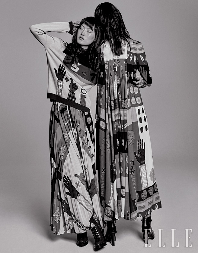 (왼쪽부터) 아티스틱 프린트가 돋보이는 핑크 니트와 플리츠스커트는 모두 가격 미정, Valentino. 레이스업 부츠와 숫자 모티프의 링은 모두 가격 미정, Valentino Garavani. 플레어 맥시 드레스는 가격 미정, Valentino. 레이스업 레더 부츠는 가격 미정, Valentino Garavani.