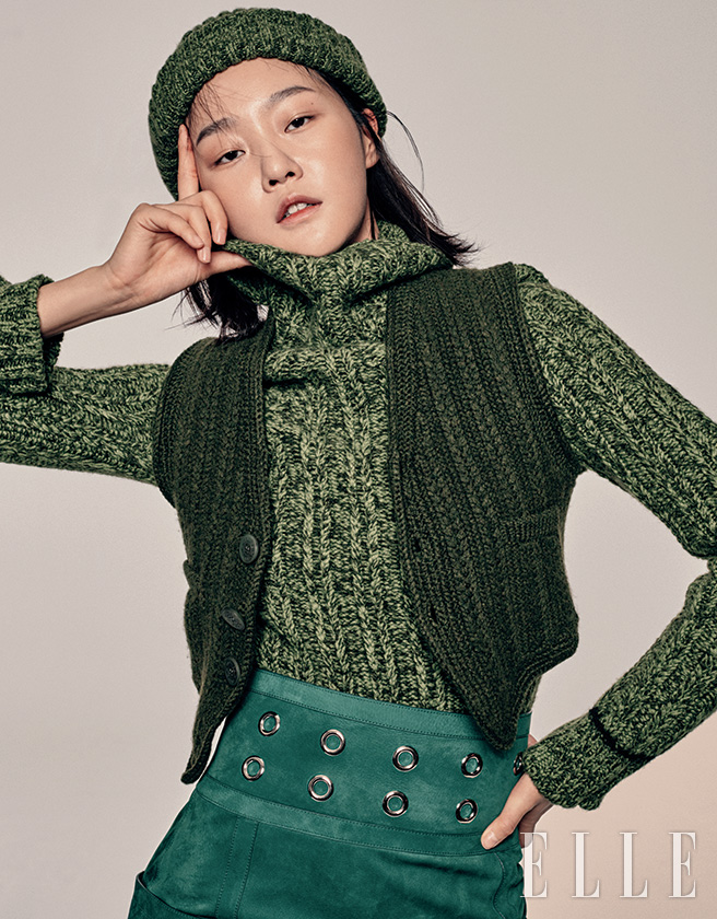 캐시미어 비니와 니트 베스트, 터틀넥, 아일렛 디테일의 롱스커트는 모두 가격 미정, Hermes.