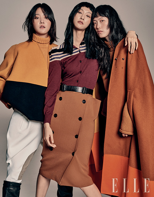 (왼쪽부터) 배색 울 재킷과 머스터드 스웨터, 화이트 조거 팬츠, 롱부츠, 스트라이프 톱과 미디스커트, 레더 벨트, 컬러 블록 롱 케이프와 터틀넥 스웨터는 모두 가격 미정, Bottega Veneta.