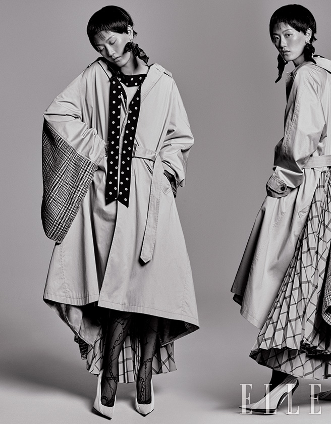 플리츠 디테일의 오버사이즈 트렌치코트와 도트 패턴의 스카프 블라우스, 스타킹, 스카프 장식의 이어링, 포인티드 토 펌프스는 모두 가격 미정, Balenciaga.
