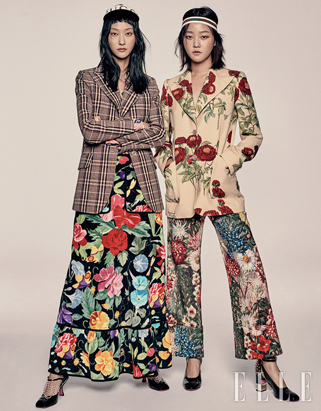 (왼쪽부터) 글렌 체크 블레이저는 3백35만원, 핑크 셔츠는 1백68만원, 플로럴 스커트는 3백5만원, 빅 로고 볼캡은 52만원, 진주 디테일의 더블 스트랩 힐은 1백60만원, 플로럴 블레이저는 4백52만원, 팬츠는 1백68만원, 헤어밴드는 가격 미정, 앵클 스트랩 힐은 1백42만원, 모두 Gucci.