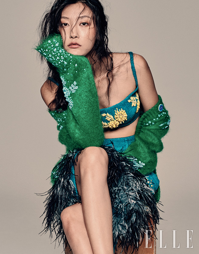 비즈를 장식한 앙고라 카디건과 브라톱, 헴라인에 타조 털을 장식한 미디스커트는 모두 가격 미정, Prada.