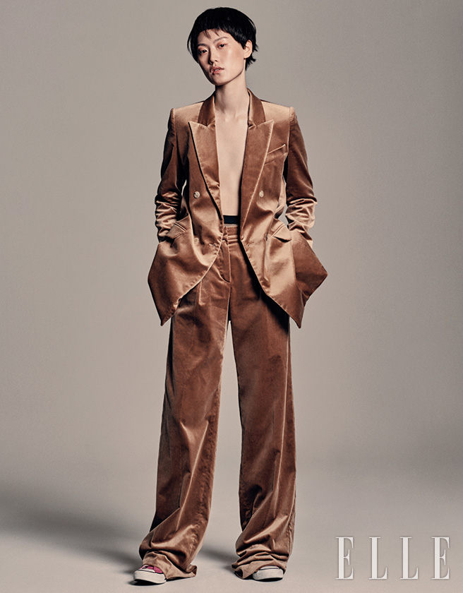 오버사이즈 실루엣의 스웨이드 블레이저와 팬츠는 모두 가격 미정, Max Mara. 메시 스타킹은 에디터 소장품.
