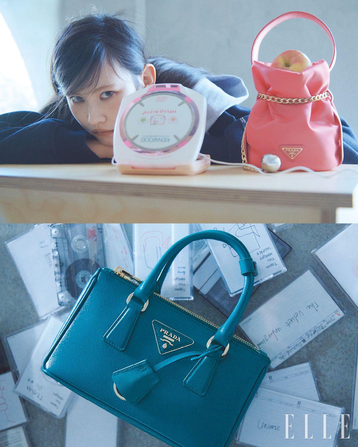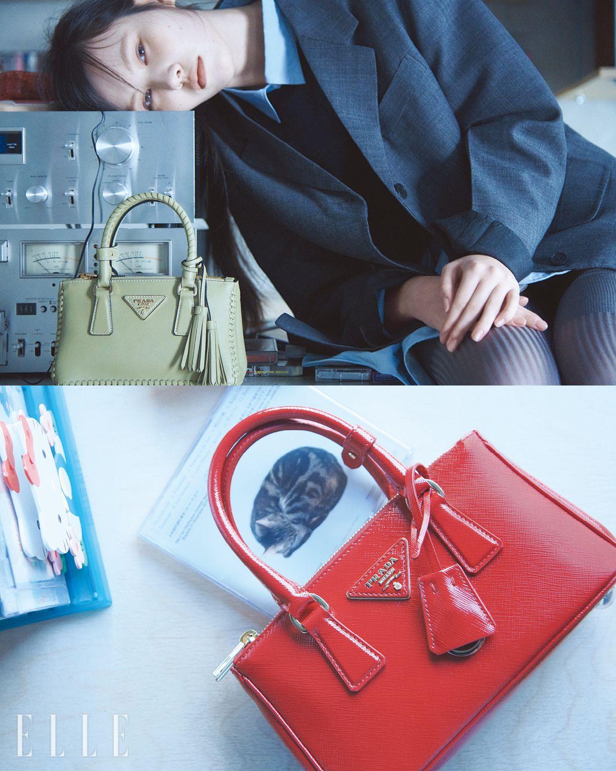 (위) 후디드 울 재킷과 프티 삭 누아르 버킷 백은 모두 Prada. (아래) 갤러리아 미니 페이턴트 사피아노 레더 백은 Prada.