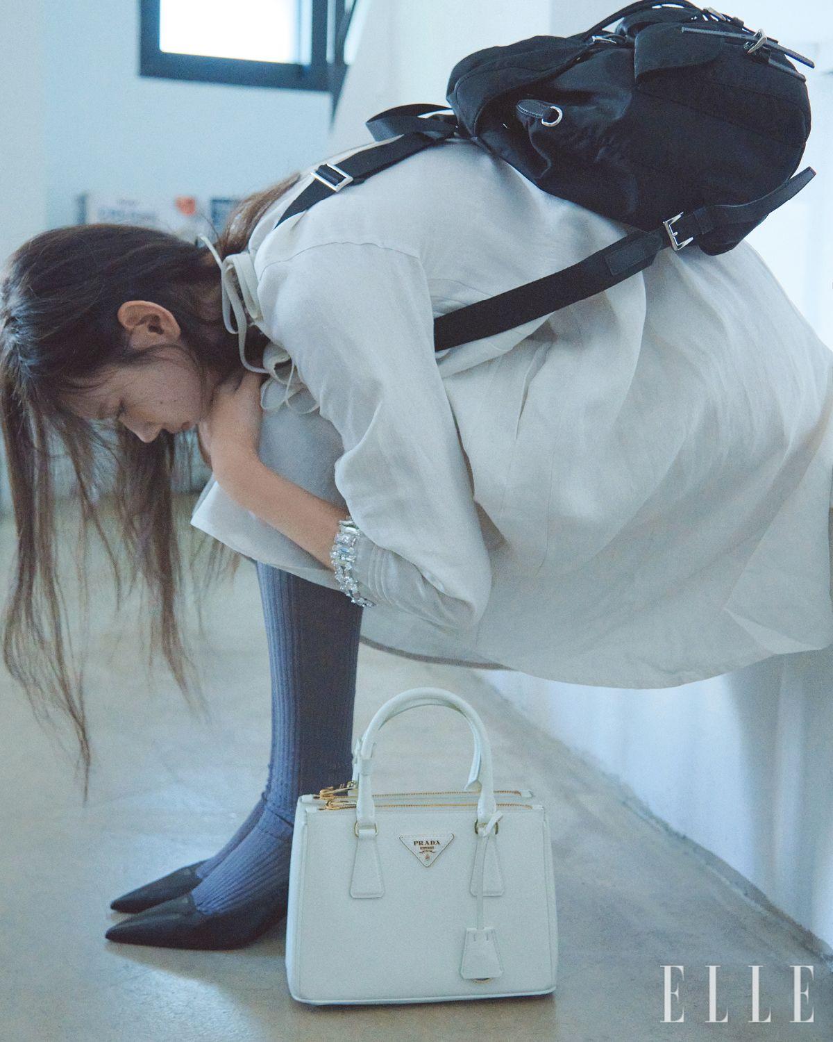리넨 드레스와 타이츠, 레더 펌프스, 파우치가 달린 미디엄 리나일론 백팩, 갤러리아 스몰 사피아노 백은 모두 Prada.