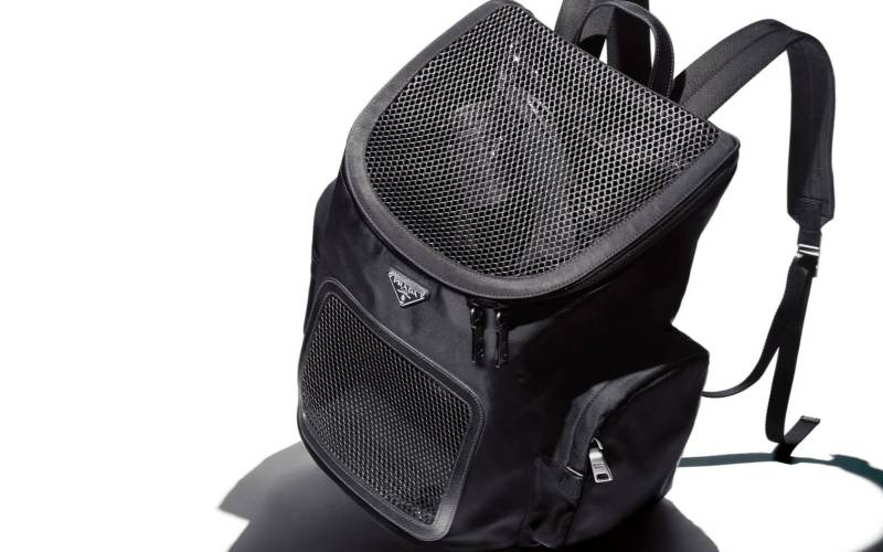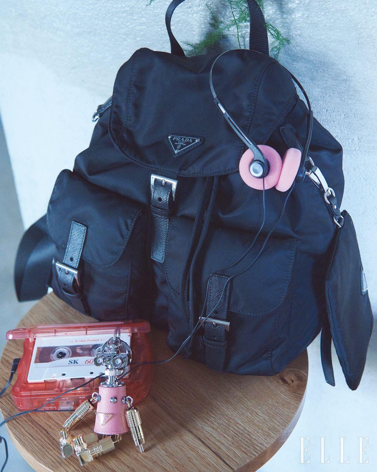 파우치가 달린 미디엄 리나일론 백팩과 로봇 사피아노 레더 백 참은 모두 Prada.