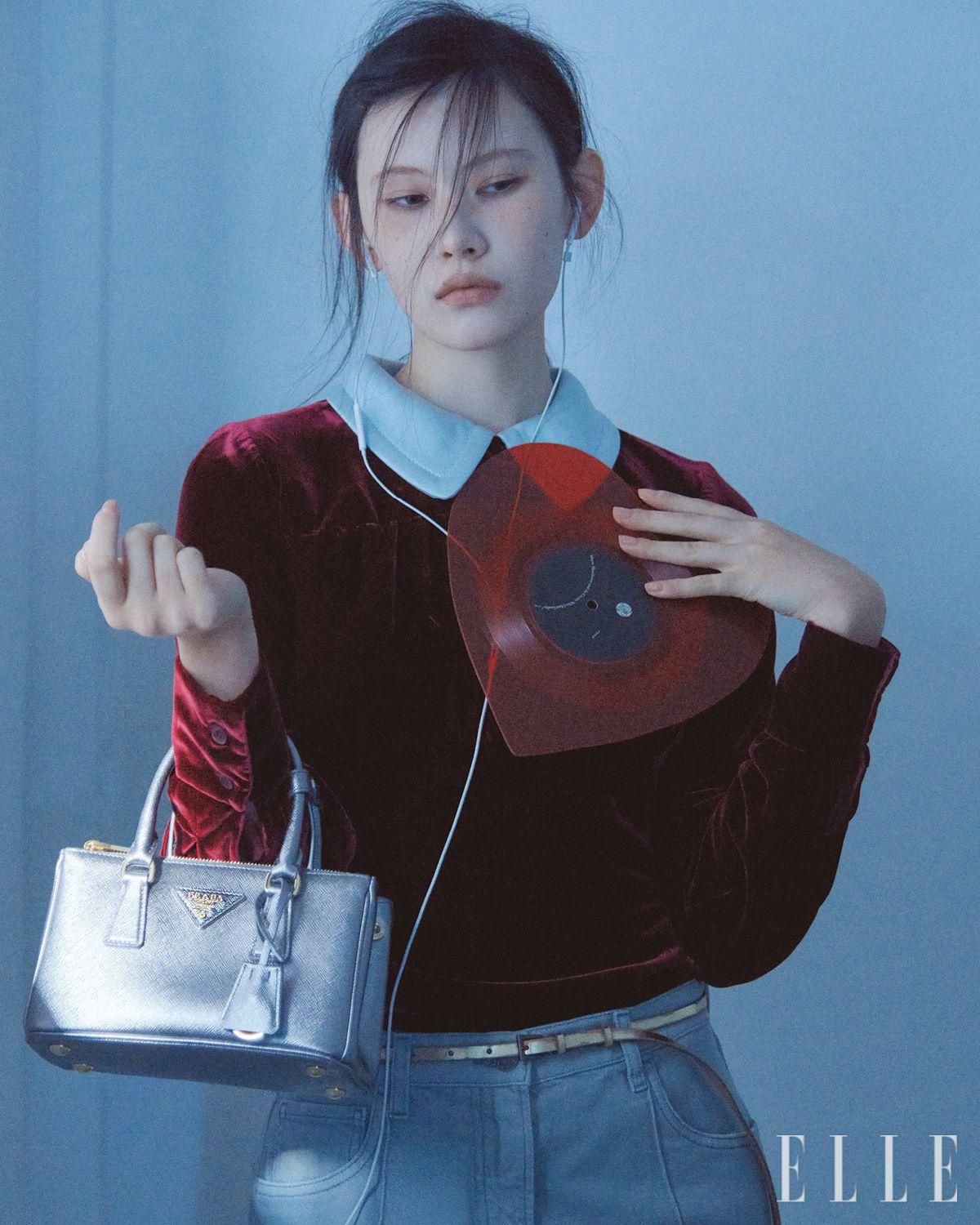 벨벳 톱과 데님 팬츠, 메탈릭 벨트, 갤러리아 페이턴트 사피아노 레더 미니 백은 모두 Prada.