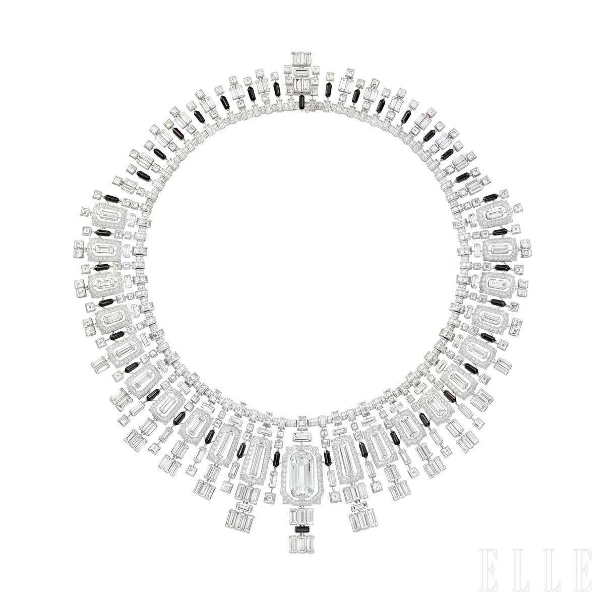 」‘유리창’을 뜻하는 이름처럼 베트라타는 스테인드글라스가 빛을 뿜어내는 순간을 주얼리로 구현했다. 사각형의 셰이프가 대칭적으로 반복되며 8.15캐럿의 직사각형 컷 다이아몬드를 중심으로 찬란한 광채가 뻗어 나온다. 아르데코 건축에서 영감받은 이 목걸이는 오닉스로 포인트를 준 방사형 구조에 20세트의 다이아몬드를 정교하게 배치해 그래픽적 리듬과 대비를 극대화했다. 복잡한 곡선을 구현하면서도 유연한 착용감을 확보해야 했던 장인들의 도전은 극도로 정밀한 링크 구조를 통해 해결됐고, 그 결과 장엄한 빛의 균형을 품은 네크리스가 탄생했다.