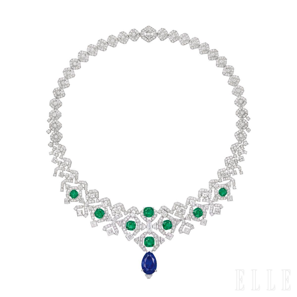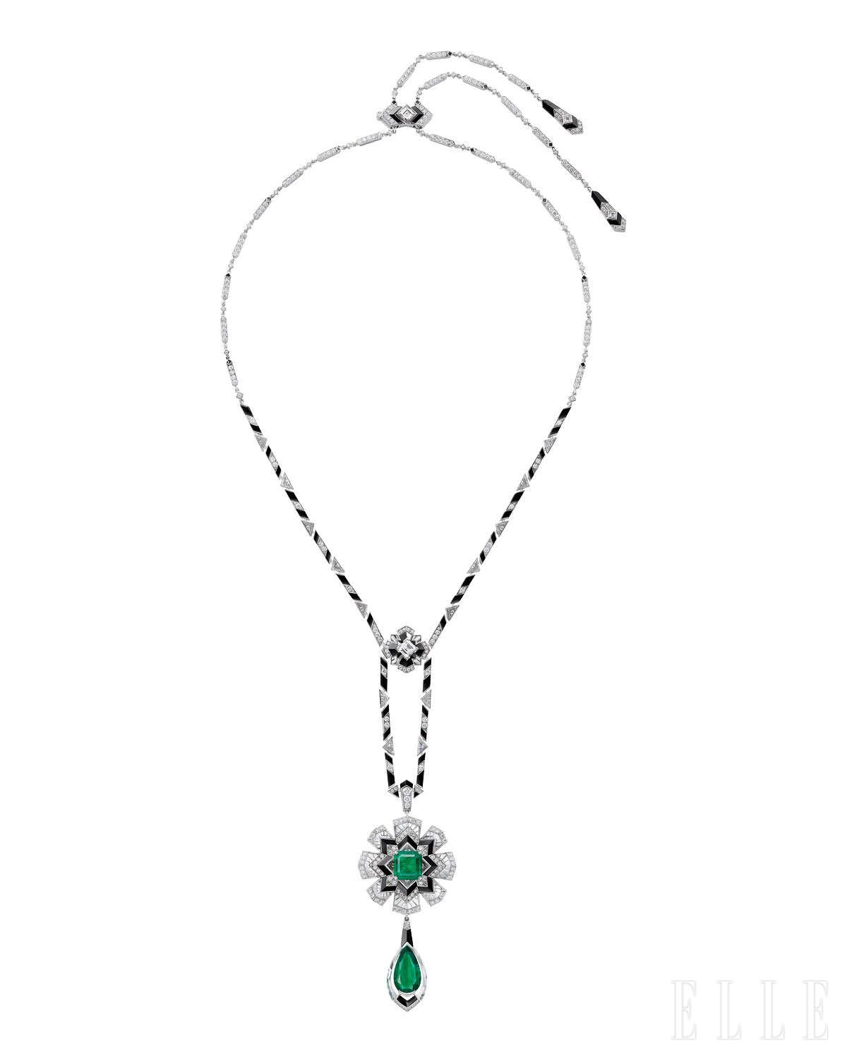 」네모로사는 총 5.37캐럿에 달하는 두 개의 콜롬비아산 에메랄드를 새로운 아르데코풍 목걸이로 재탄생시킨 작품이다. 페어 셰이프 에메랄드는 우아한 펜던트로 변신했고, 에메랄드 컷 스퀘어 에메랄드는 다이아몬드· 오닉스· 수정으로 이뤄진 로제트 모티프의 중심에 자리했다. 스톤이 마치 공중에 떠 있는 효과를 내기 위해 까다로운 인비저블 세팅을 택했고, 이는 장인 정신의 결정체로 남았다.