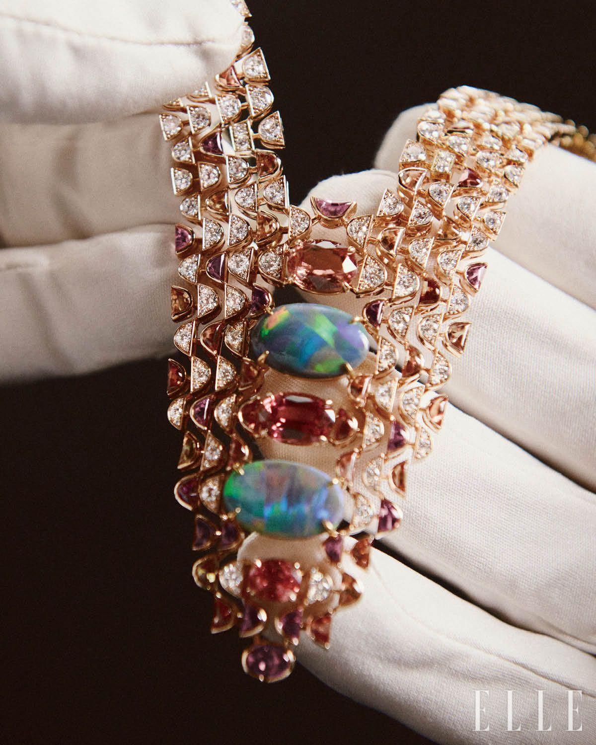」아르헨티나 카파야테 지역의 협곡과 같은 이름의 이 네크리스는 컬러 탐구를 중심에 둔 작품이다. 장인들은 두 개의 눈부신 오팔을 중심에 세워 레드와 오렌지, 옐로의 세 가지 빛이 목걸이 전체로 퍼져 나가도록 구성했다. 각 오팔을 둘러싼 움바산 컬러 사파이어는 옐로골드와 핑크골드 메시와 어우러지며 따스한 색의 흐름을 완성한다. 따뜻한 색의 스펙트럼이 하이 주얼리로 재해석된 순간이다.
