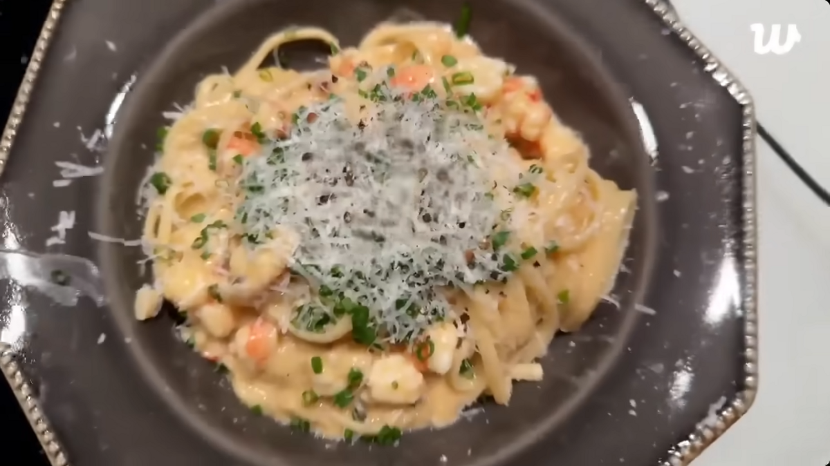 정국은 이어, 올리브유와 쪽파, 새우 머리로 파기름을 낸 뒤 마늘과 페페론치노, 후추를 넣어 볶았습니다. 물과 성게알 간장 소스, 생크림과 버터를 넣고 끓인 뒤 설탕과 새우살을 더해 소스도 만들었고요. 끝으로 면을 함께 볶은 후 치즈를 갈아 넣어 '성게알 간장 크림 새우 파스타'를 완성했습니다.