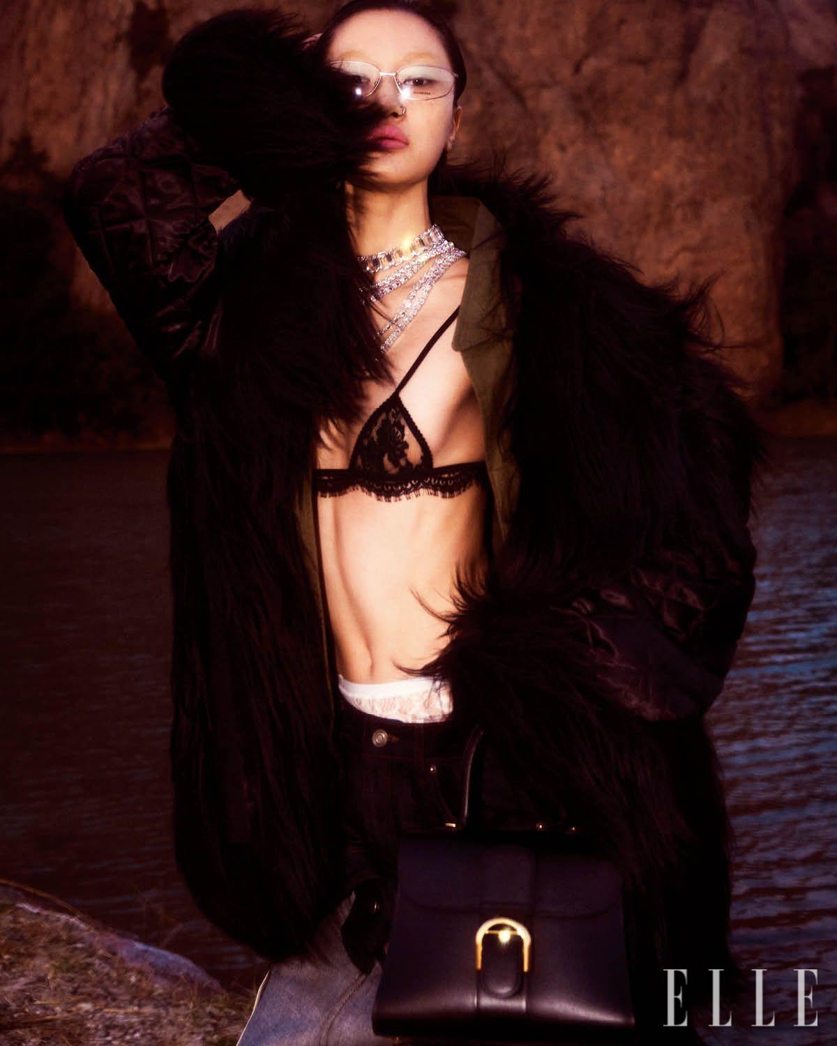퍼 아우터웨어와 레이스 브라톱은 모두 가격 미정, Dolce & Gabbana. 데님 스커트는 가격 미정, Juun. J. 실버 프레임의 안경은 50만원, Balenciaga byKering Eyewear. 레이어드한 네크리스는 2백40만원, Swarovski. 브리앙 백은 1천만원대, Delvaux. 레이스 타이즈는 에디터 소장품.