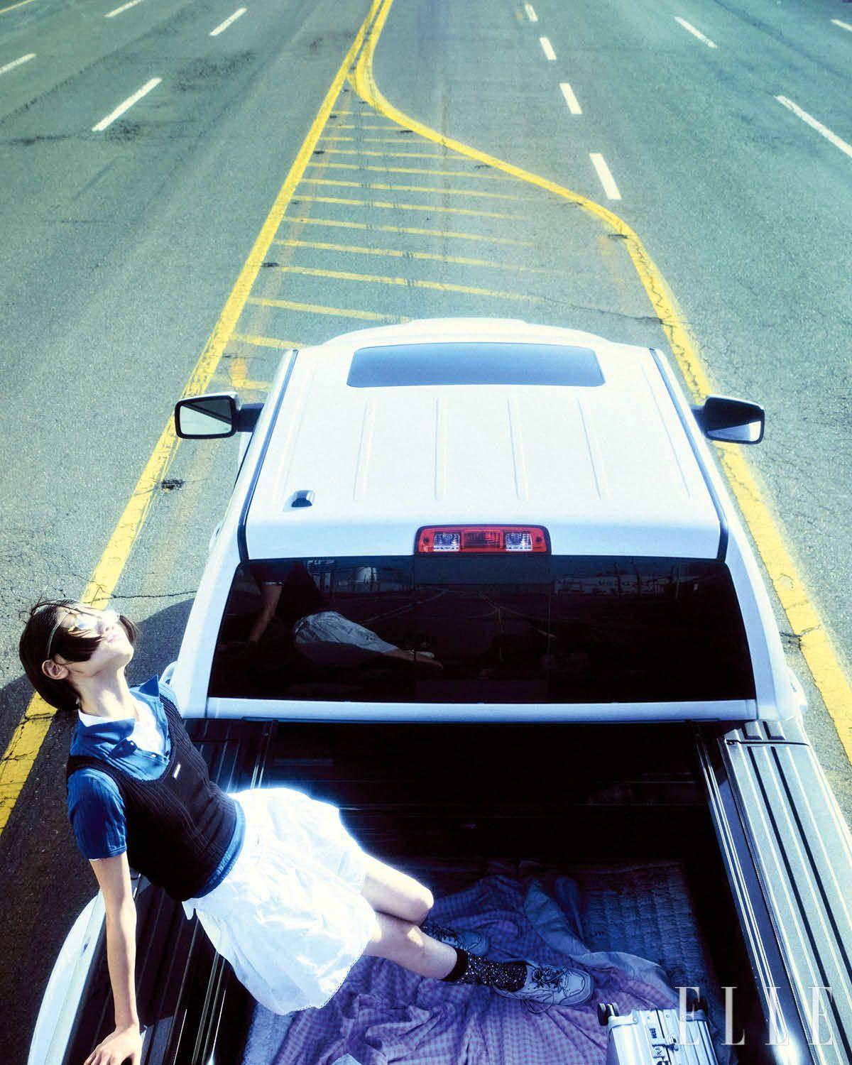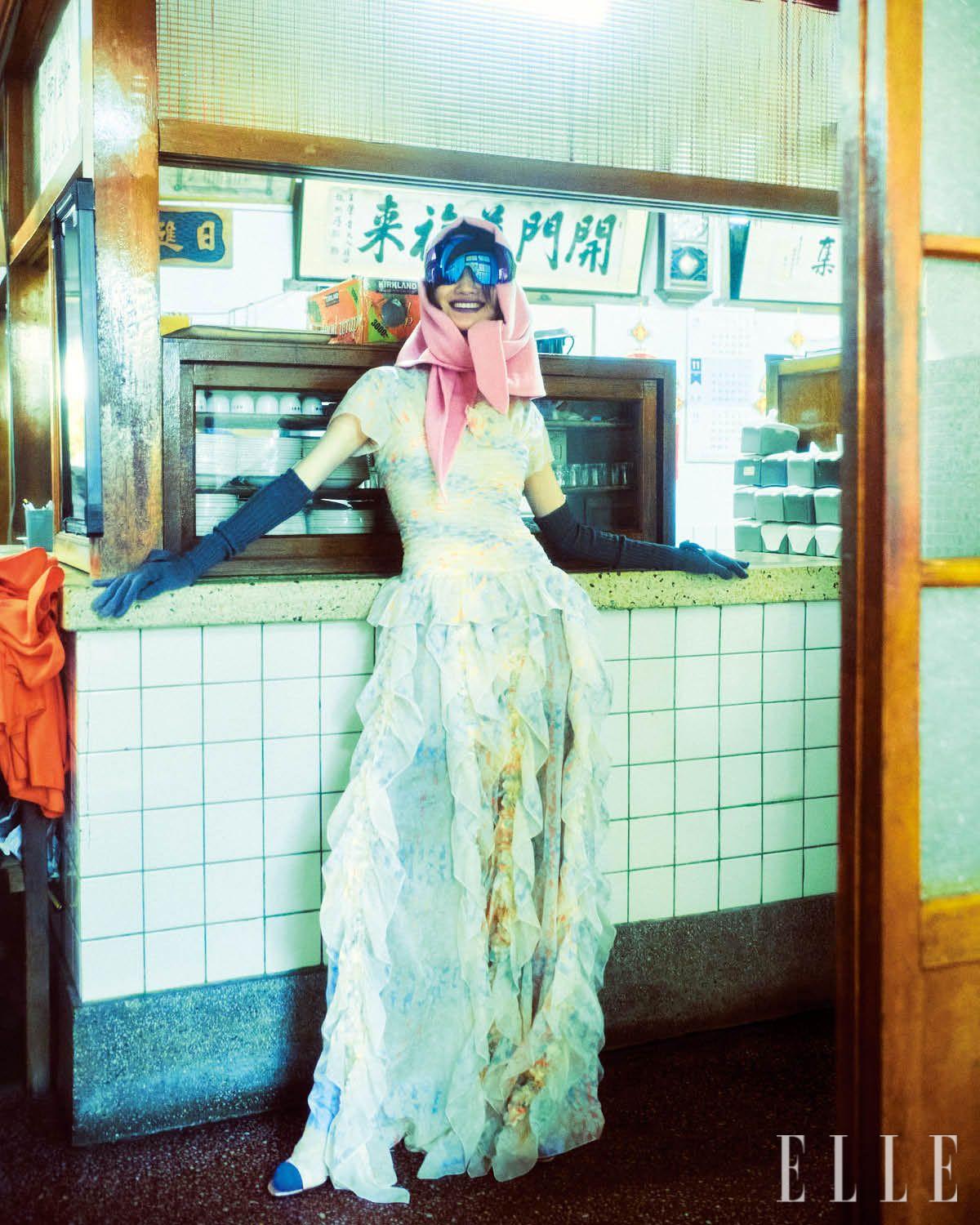 러플 드레스는 가격 미정, Chanel. 새틴 뮬은 가격 미정, Gucci. 고글은 1백17만5천원, Balenciaga by Kering Eyewear. 핑크 스카프는 59만원대, N°21. 니트 글러브와 블루 컬러 양말은 가격 미정, 모두 Shu Shu/Tong.