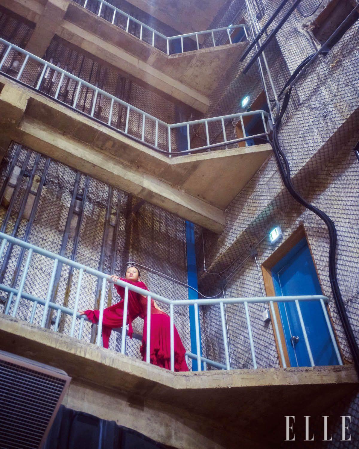 오프숄더 드레스는 가격 미정, Valentino. 메달 모티프의 네크리스는 가격 미정, Balenciaga. 투명한 핑크 프레임의 안경은 49만4천원, Prada byEssilorluxottica. 손목에 낀 리본 장식의 헤어 스크런처는 가격 미정, Dior. GG 크리스털 장식의 타이즈는 가격 미정, Gucci.