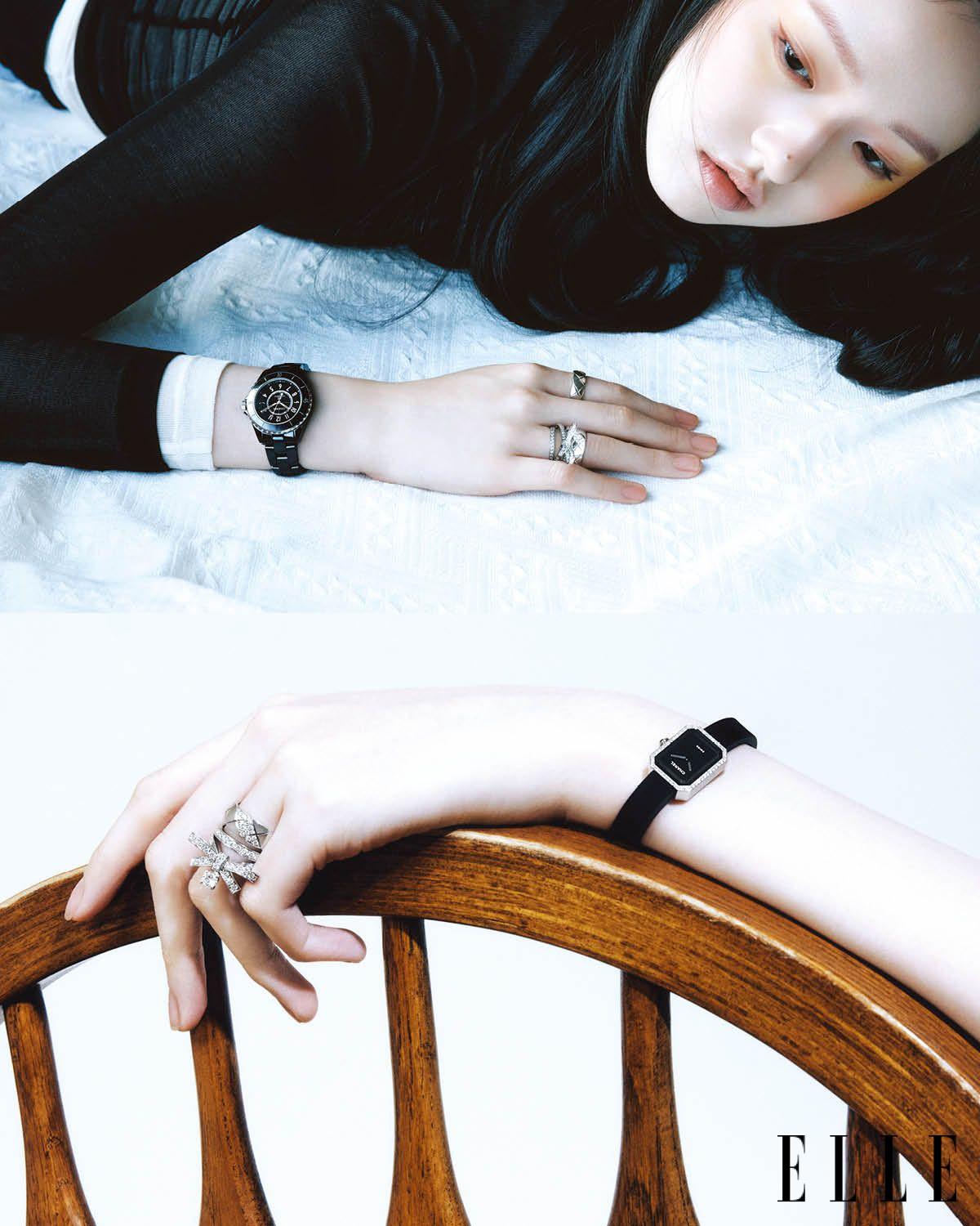 (아래) 블랙 세라믹 소재 ‘J12’ 워치, 리본 모티프의 ‘루반’ 링, 검지에 낀 ‘코코 크러쉬 스몰’ 링과 약지에 낀 다이아몬드 세팅 버전의 ‘코코 크러쉬 스몰 링’은 모두 Chanel Watches & Fine Jewelry.