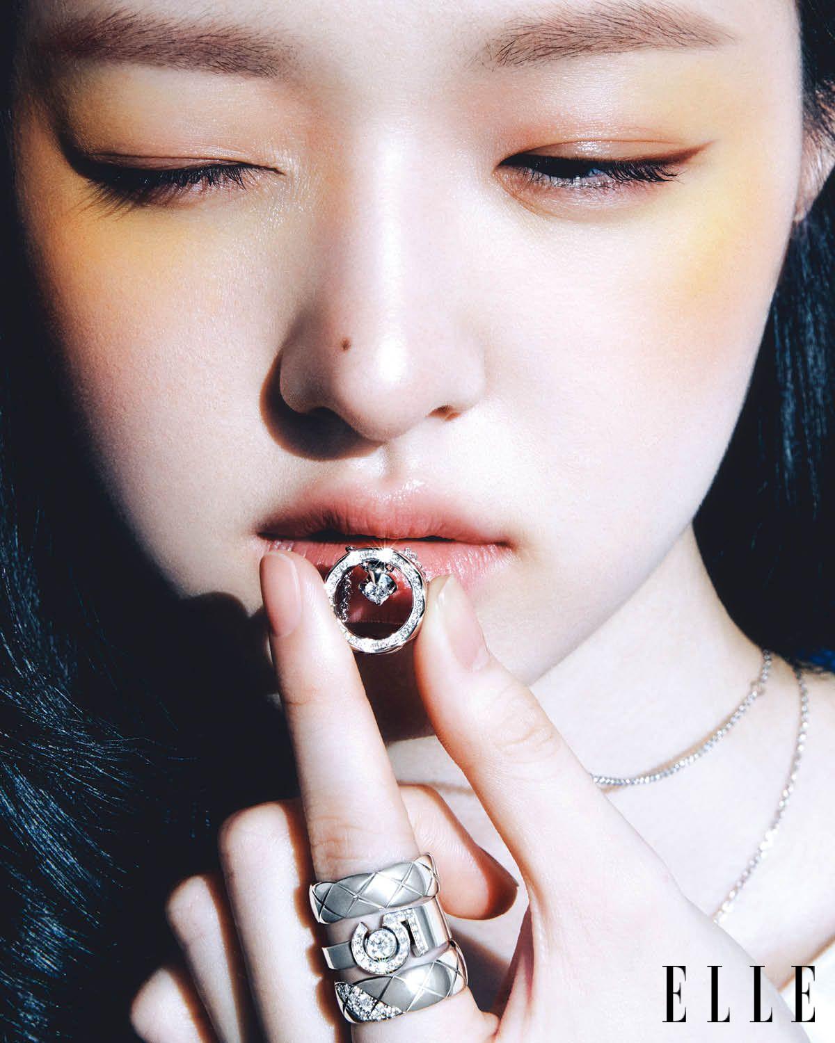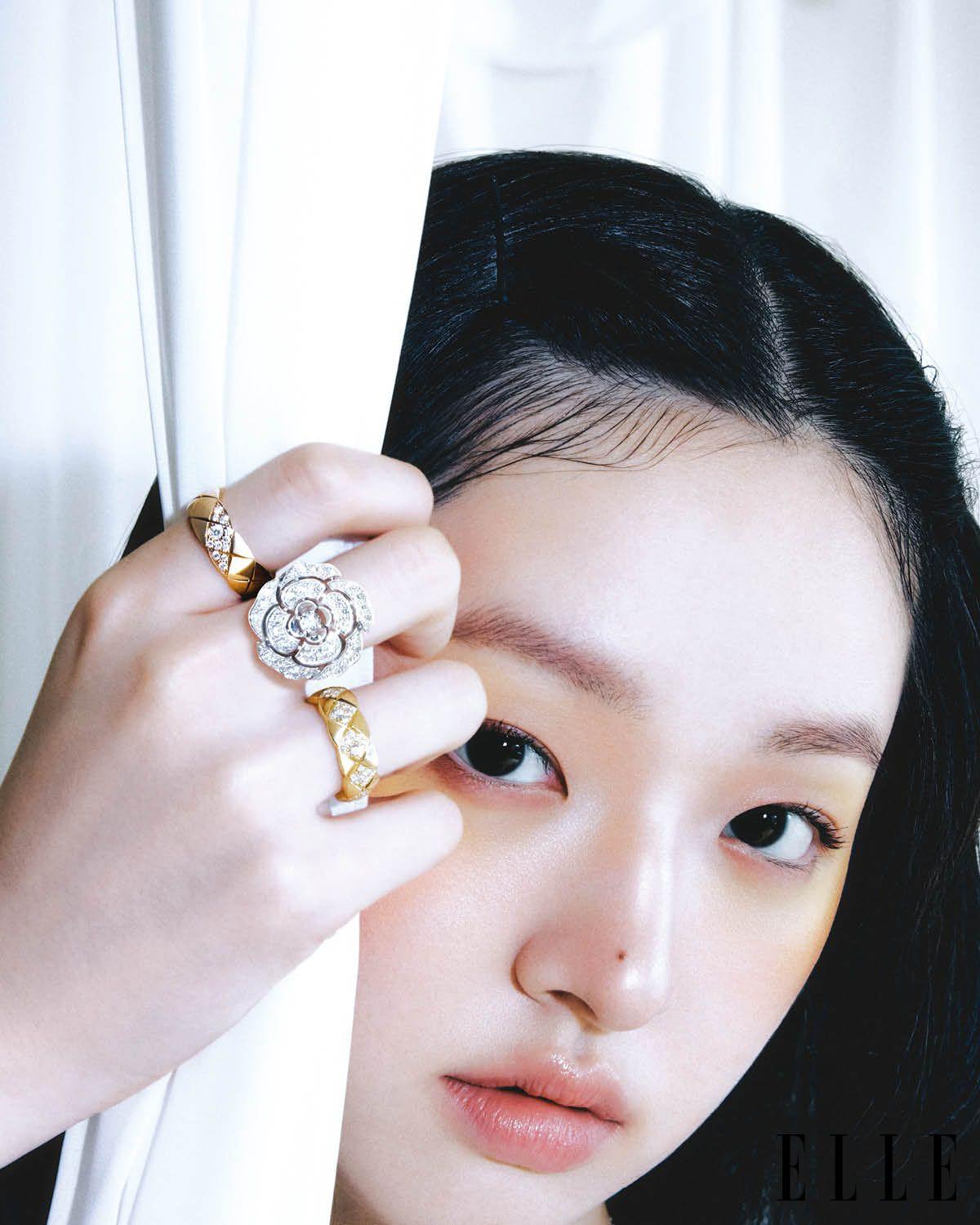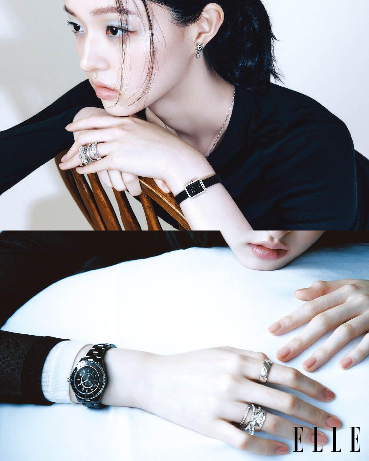 숫자 ‘5’ 모티프에 다이아몬드를 더한 18K 화이트골드 ‘N°5 네크리스’, 링 모양의 펜던트에 퀼팅 디테일과 다이아몬드로 장식한 18K 화이트골드 ‘코코 크러쉬 네크리스’, 손목에 착용한 퀼팅 디테일의 18K 화이트골드 ‘코코 크러쉬 미니 브레이슬릿’, 다이아몬드를 세팅한 18K 화이트골드 ‘코코 크러쉬 브레이슬릿’, 블랙 세라믹에 다이아몬드를 세팅한 ‘J12’ 워치, 검지에 레이어드한 다이아몬드 세팅 버전 18K 화이트골드 ‘코코 크러쉬’ 스몰 링’, 숫자 5 모티프의 18K 화이트골드 ‘N°5 링’, 18K 화이트골드 ‘코코 크러쉬’ 스몰 링은 모두 Chanel Watches & Jewelry.