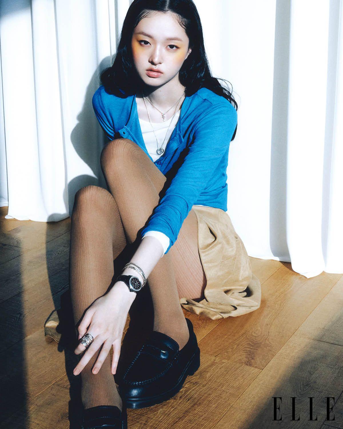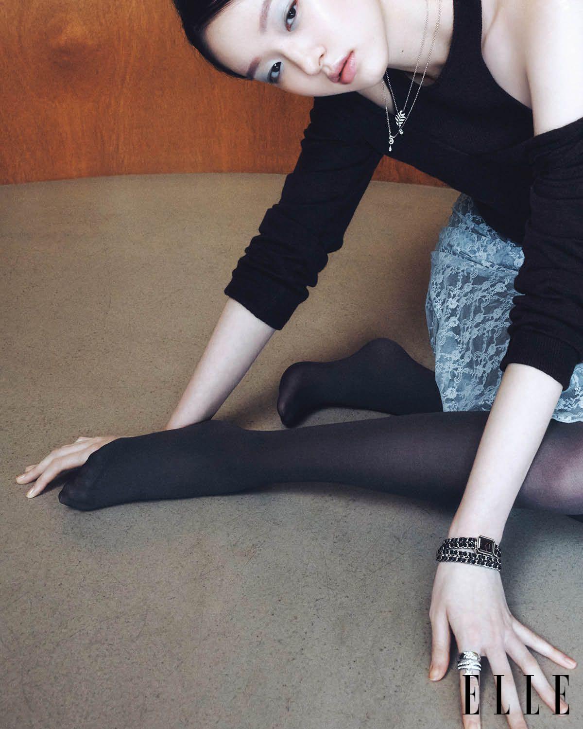 블랙 레더 스트랩을 엮은 두 줄의 스틸 체인 브레이슬릿과 스틸 케이스, 블랙 래커 다이얼을 매치한 ‘프리미에르 체인 더블 로우 워치’, 검지에 레이어드한 다이아몬드 세팅 버전의 18K 화이트골드 ‘코코 크러쉬 스몰 링’과 18K 화이트골드에 다이아몬드를 세팅한 별 모티프의 ‘꼬메뜨 링’, 섬세한 깃털 모티프 펜던트에 다이아몬드를 세팅한 18K 화이트골드 ‘플륌 드 샤넬 네크리스’와 숫자 5 모티프의 18K 화이트골드 ‘N°5 네크리스’는 모두 Chanel Watches & Fine Jewelry.