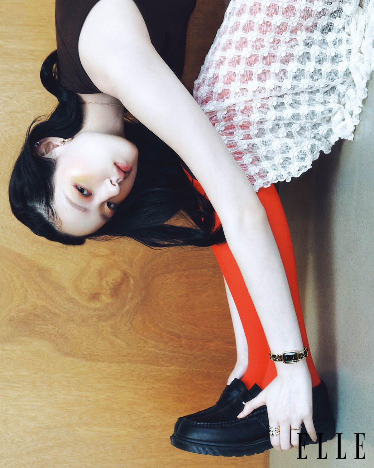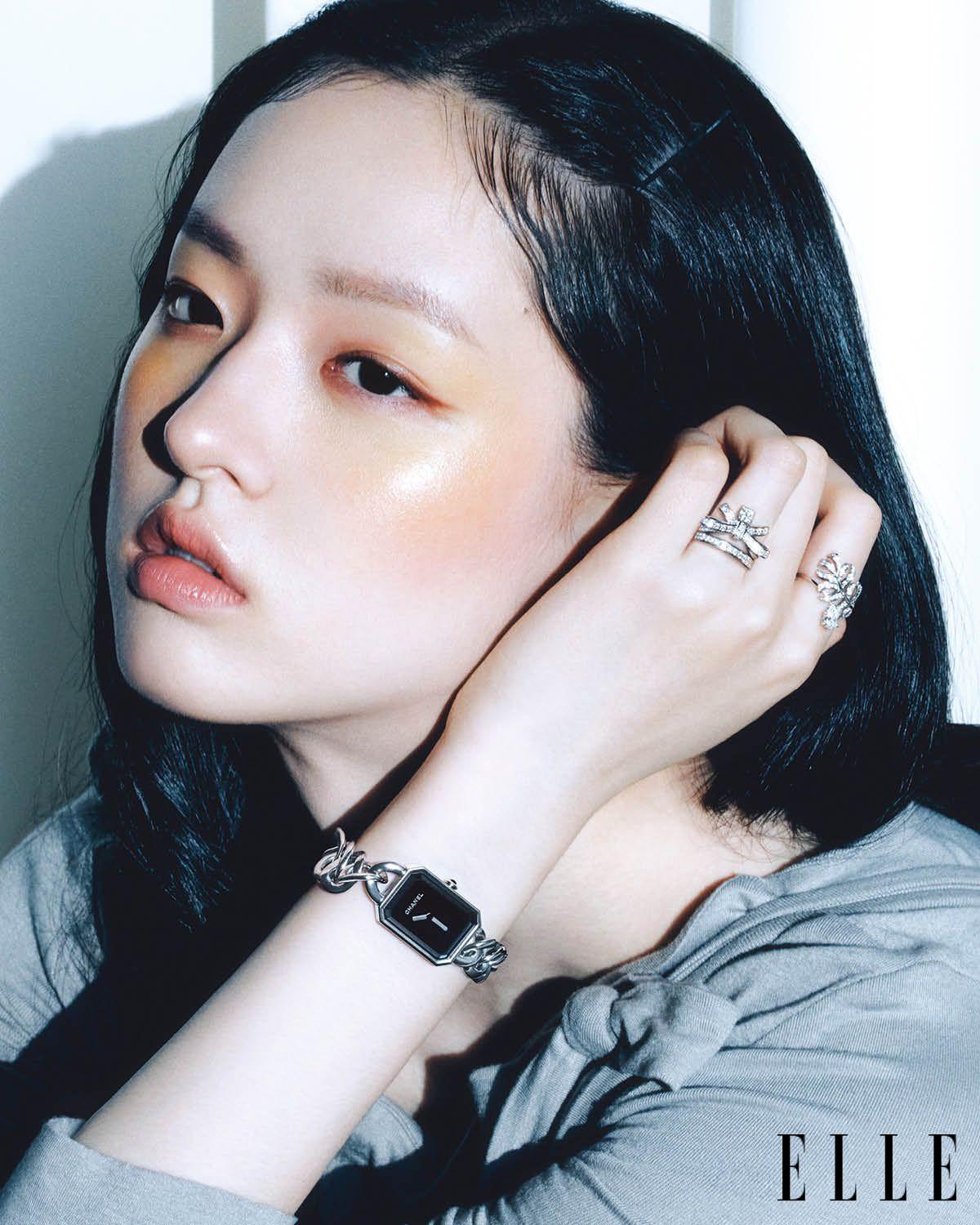 숫자 5 모티프와 다이아몬드 세팅이 특징인 18K 화이트골드 ‘N°5 이어링’, 숫자 5와 드롭 모티프에 다이아몬드를 세팅한 18K 베이지골드 ‘N°5 네크리스’, 퀼팅 모티프를 새긴 알파벳 C 모티프 펜던트에 루비를 세팅한 18K 베이지골드 ‘코코 크러쉬 네크리스’, 스틸 케이스에 두 줄의 스틸 체인 브레이슬릿을 더한 ‘프리미에르 아이코닉 체인 더블 로우 워치’와 18K 옐로골드로 코팅한 스틸 케이스, 두 줄의 체인 브레이슬릿을 매치한 ‘프리미에르 아이코닉 체인 더블 로우 워치’, 퀼팅 모티프를 새긴 18K 화이트골드 ‘코코 크러쉬 스몰 링’은 모두 Chanel Watches & Fine Jewelry.