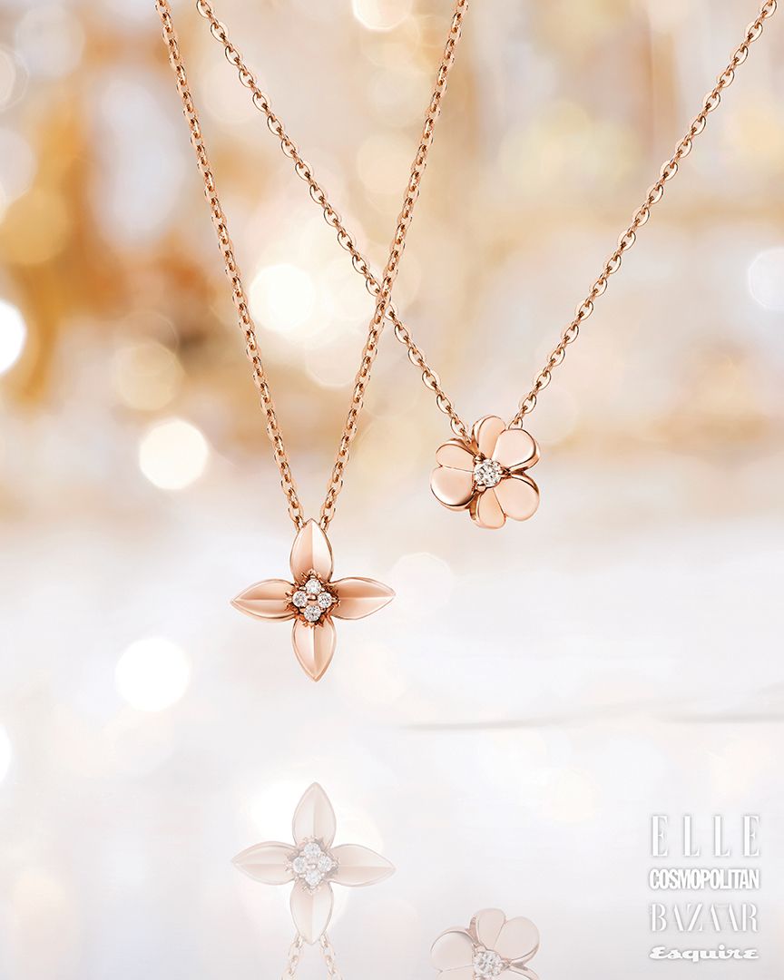 입체적인 메탈 플라워의 균형미와 우아한 형태감이 돋보이는 벨로나 랩그로운 다이아몬드 펜던트는 34만원, 겹겹이 포개진 꽃잎의 구조적 아름다움이 인상적인 핑크 골드 소재의 플리앙 다이아몬드 펜던트는 30만원, 핑크 골드 소재의 펠샤인 체인 네크리스는 각각 47만원 모두 ROSEED’OR.