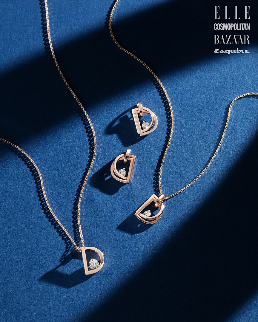 D 모티프가 조형적으로 연결된 디자인이 특징이다. 로즈 골드 소재의 더블 디 네크리스는 59만원대 DIDIER DUBOT.