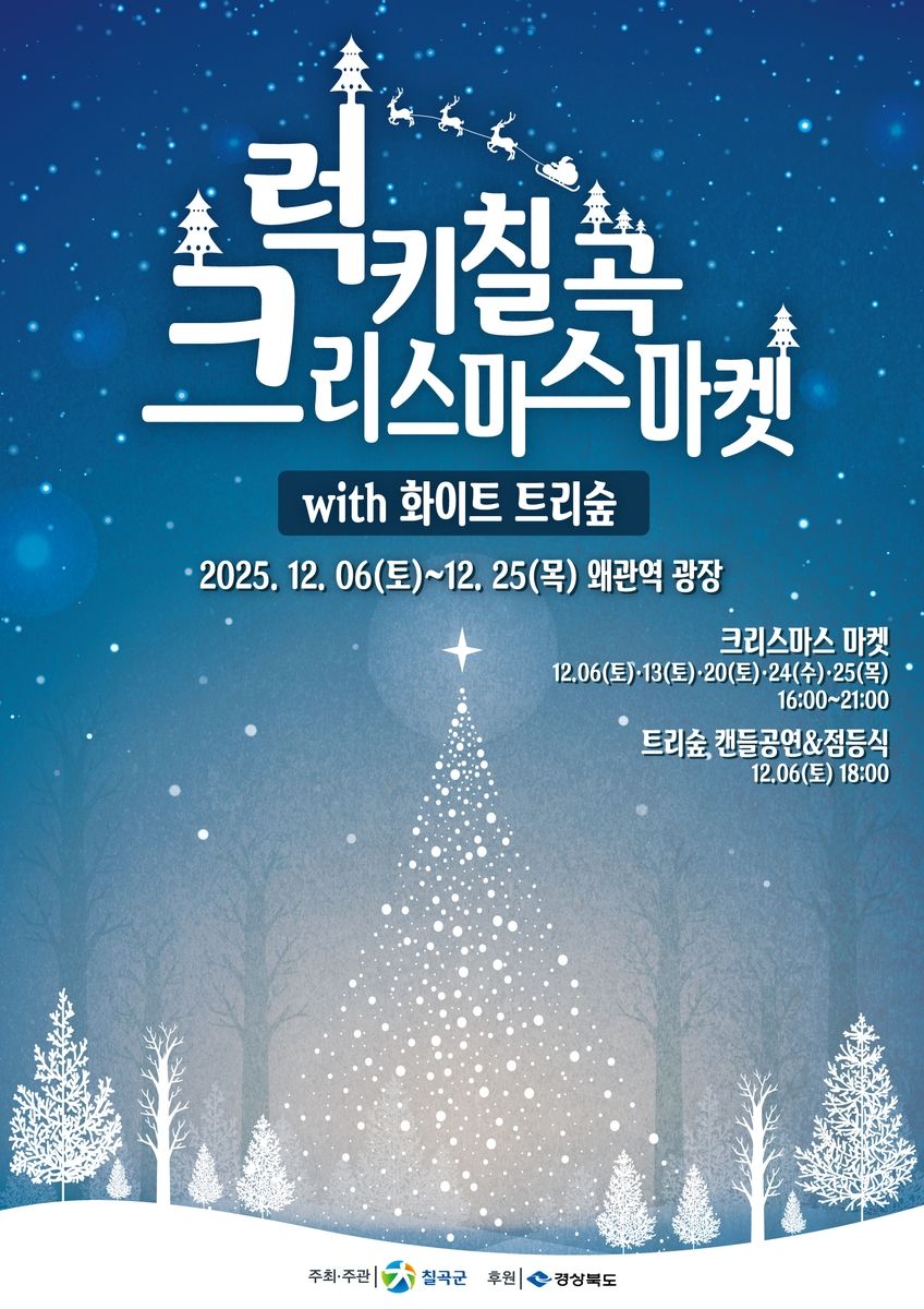 경북 칠곡군에선 다음달 6일부터 25일까지 '2025 럭키칠곡 크리스마스마켓'이 총 5회에 걸쳐 열려요. 크리스마스 용품과 겨울 간식을 만나볼 수 있는 것은 물론 미니트리와 케이크 만들기, 소원등 달기 등 다양한 체험 프로그램이 예고됐습니다. 여기에 버스킹과 마술, 마임 공연과 함께 인플루언서 '산티'의 1분 캐리커처 이벤트까지 더해져 즐길거리도 풍성한 편. 대형트리를 포함한 화이트 트리숲이 조성된 만큼 이를 배경으로 인증샷을 찍기에도 좋을 것 같군요.