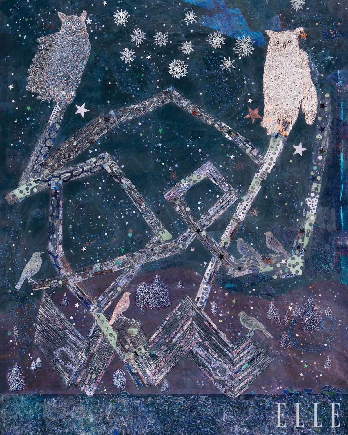 진정 따뜻하다고 말할 수 있는 겨울이 있다. 강원도 인제 숲 한가운데, 시커먼 밤하늘에 촘촘히 박힌 별을 올려다보던 순간이 내겐 그랬다. 묵직하게 내려앉은 고요를 깨우는 건 이따금 발을 옮기는 소리와 이름 모를 동물들의 기척밖에 없는 시간. 별들은 밝고 어두워지기를 거듭했고, 느릿하게 부유하는 눈송이만이 시커먼 여백을 채울 뿐이었다. 키키 스미스의 ‘윈터 트와일라잇’과 마주한 건 수많은 사람이 수많은 작품을 스쳐 지나는 프리즈서울 전시장에서다. ‘하나라도 더 보자’며 분주하게 옮기는 걸음은 이 작품 앞에서 멈췄다. 어떤 그림은 다른 차원으로 향하는 문 같아서 기어코 사람의 덜미를 잡고야 만다. 포근한 질감의 종이에 인쇄된 형태와 색, 그 위로 금박이 더해진 이 그림은 살아 있는 숲이다. 희끗희끗 눈이 내려앉은 침엽수 앞으로 얽히고설킨 가지인 듯한 구조물이 화면을 가로지른다. 새들은 각자 편안한 자리에 적당한 간격을 유지한 채 밤을 지새고, 부엉이들의 눈은 어둠 속에서도 단연 빛난다. 밤하늘에 찍힌 무수한 점은 단지 별만 의미하지 않는다. 공기 중의 얼음 입자, 쌓인 눈에 반사된 달빛, 잔잔한 바람의 움직임을 기록한 흔적일 테다.