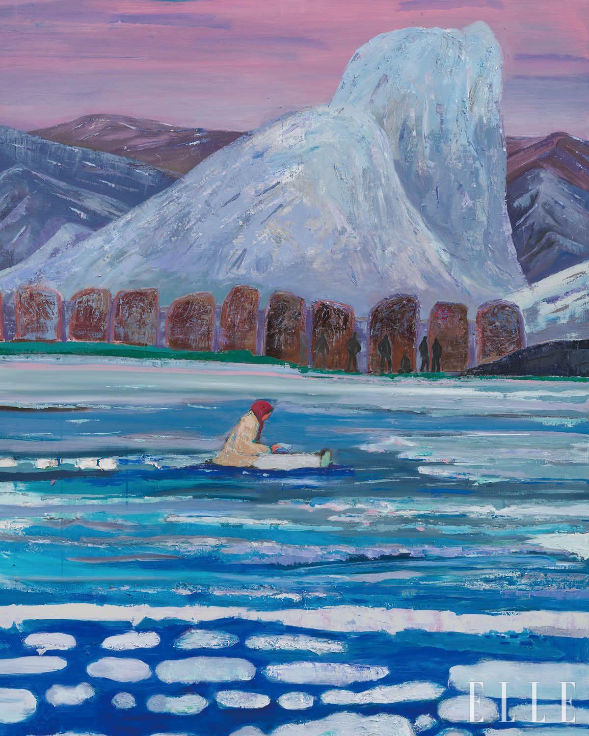 한겨울의 독서라니. 그림 속에 앉아 있는 여인의 사연이 궁금했다. 이 낯설고 이국적인 겨울 풍경은 2022년 초겨울, 학고재 신관에서 열린 김은정 작가의 개인전에서 만났다. 핑크빛 하늘 아래로 설산이 걸려 있고, 호수에는 하얀 덩어리들이 뭉게뭉게 떠 있다. ‘뭉게뭉게’라고 한 이유는 눈이 아니라 구름이 반사된 모습이어서다. 작가는 튀니지 여행에서 목격한 사람을 소재로 삼았다고 했다. 해변에 앉아 오래도록 책을 읽던 히잡 쓴 여인의 모습을 작가는 겨울 호수로 옮겼다. 무릇 겨울 독서란 따뜻한 안방에서 귤 까먹으며 하는 것 아닌가.