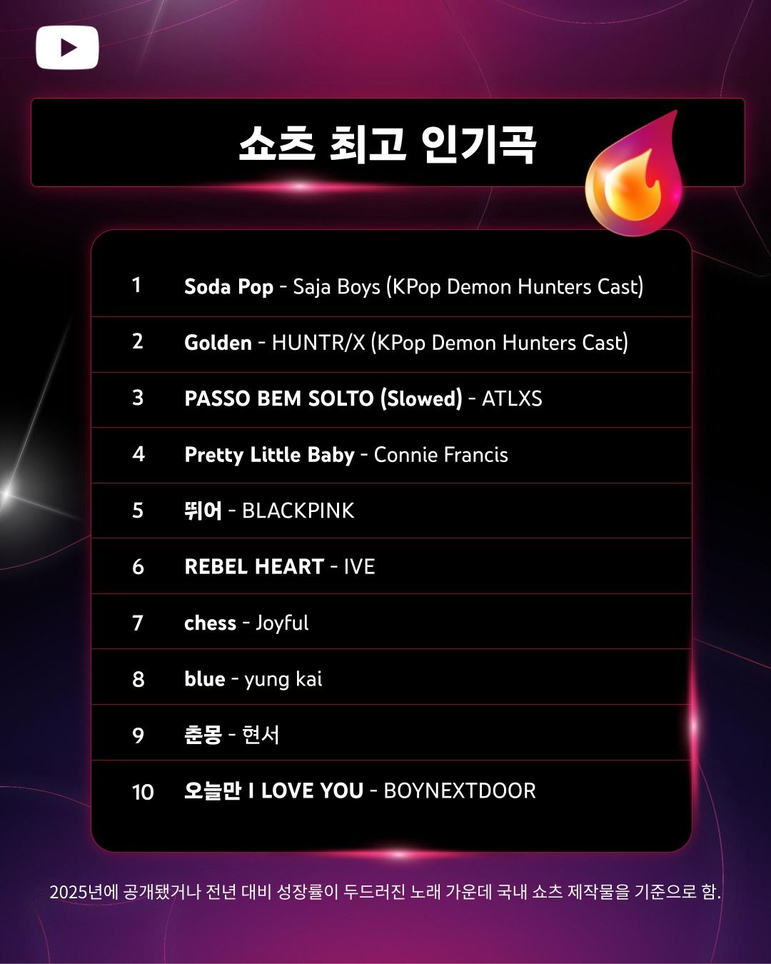 특히 쇼츠 배경음으로 인기를 얻은 노래는 '소다 팝'이었습니다. '골든'은 2위에 자리했어요. 또 <케이팝 데몬 헌터스>의 득세에 이어 ATLXS의 'PASSO BEM SOLTO', Connie Francis의 'Pretty Little Baby' 등이 쇼츠 제작에 가장 많이 쓰인 곡으로 꼽혔습니다.
