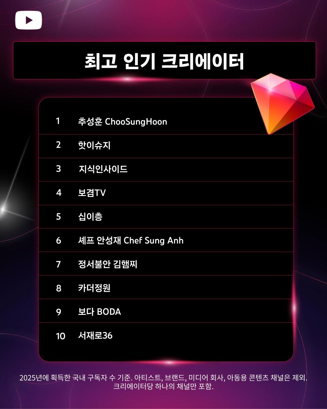 올해 구독자가 가장 많이 오른 최고의 인기 크리에이터는 '아조씨' 추성훈이었습니다. 핫이슈지, 셰프 안성재, 카더정원 등 유명인의 유튜브도 인기를 끌었고요. AI 햄스터 캐릭터의 현실 회사 생활로 공감을 얻은 정서불안 김햄찌의 약진이 두드러졌습니다.