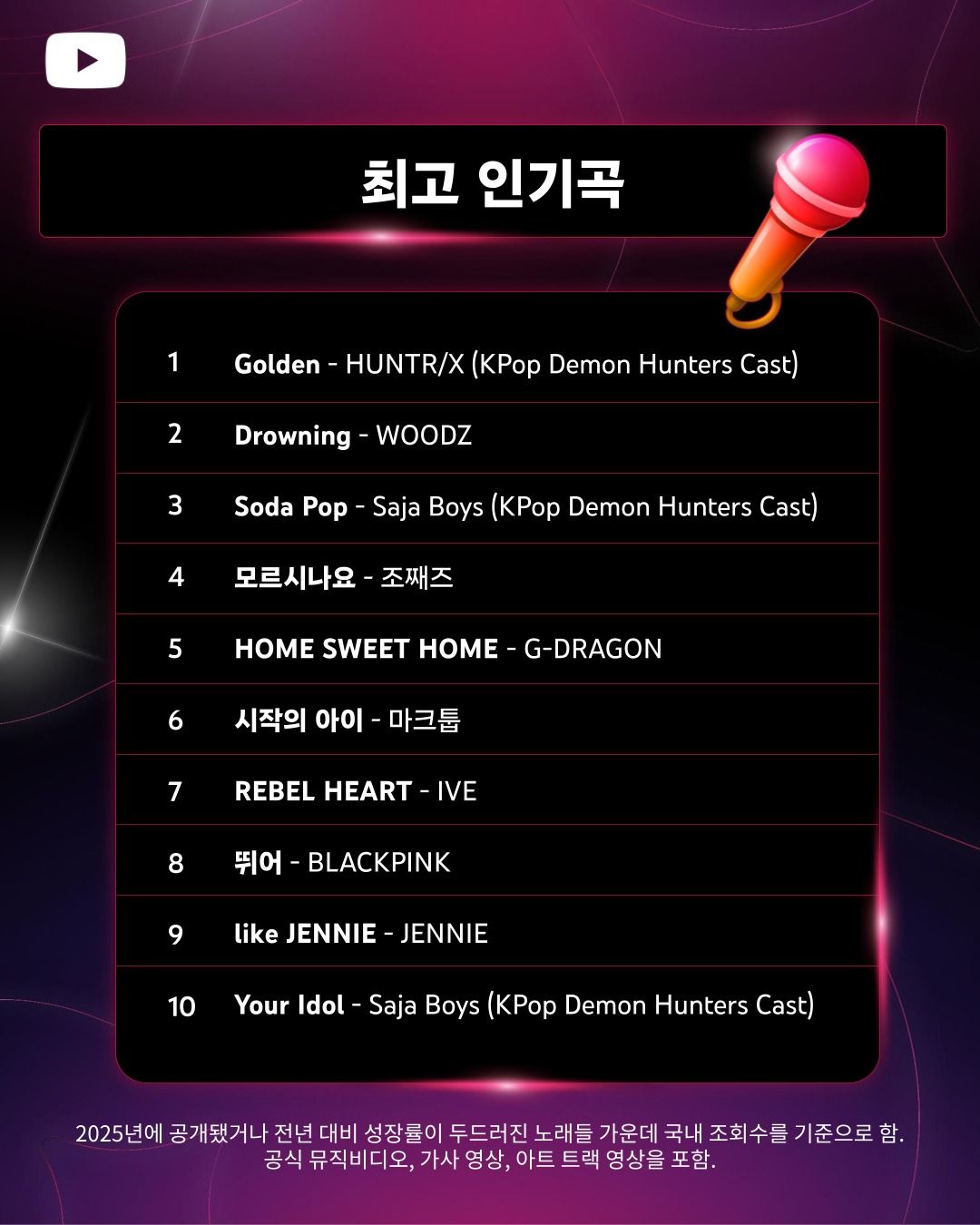 2025년 발매됐거나 전년 대비 큰 성장폭을 보인 올해 최고의 인기곡은 역시 <케이팝데몬 헌터스>의 '골든'이었습니다. 이 외에도 '소다 팝'과 '유어 아이돌'이 각각 3위와 10위에 오르며 작품의 위용을 증명했어요. 또 유튜브에서 재조명되며 역주행 신화를 쓴 우즈의 '드라우닝'이 2위입니다. 조째즈의 '모르시나요'와 마크툽의 '시작의 아이'는 유튜브를 통해 대중에 효과적으로 다가간 사례로 언급됩니다.