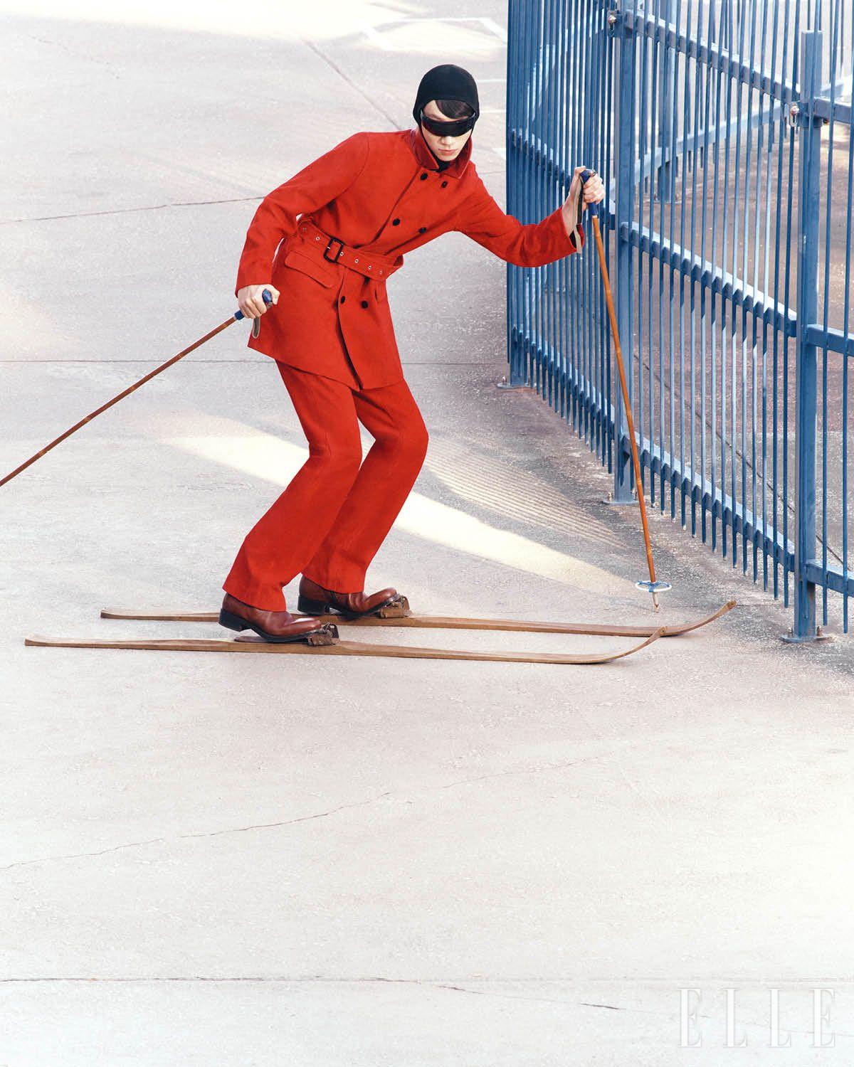 스웨이드 소재 레드 코트와 스웨이드 팬츠는 가격 미정, 모두 Ernest W. Baker by 10 Corso Como Seoul. 바라크라바는 가격 미정, Valentino Garavani. 선글라스는 89만원대, Ray-Ban by Essilorluxottica. 레더 부츠는 가격 미정, Prada.