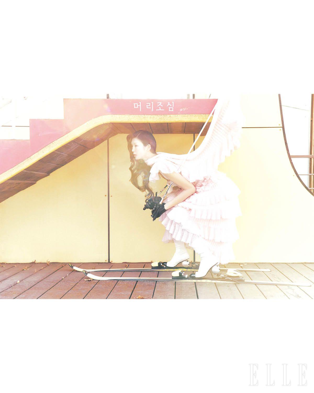 모헤어 숄은 3백21만원, 리본 디테일의 러플 롱 드레스는 1천98만원, 로고 엠브로이더리 레더 글러브는 1백84만2천원, 펄 힐 하이 부츠는 4백30만원대, 모두 Chanel.