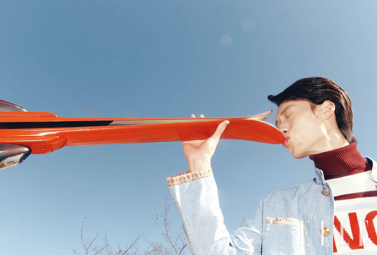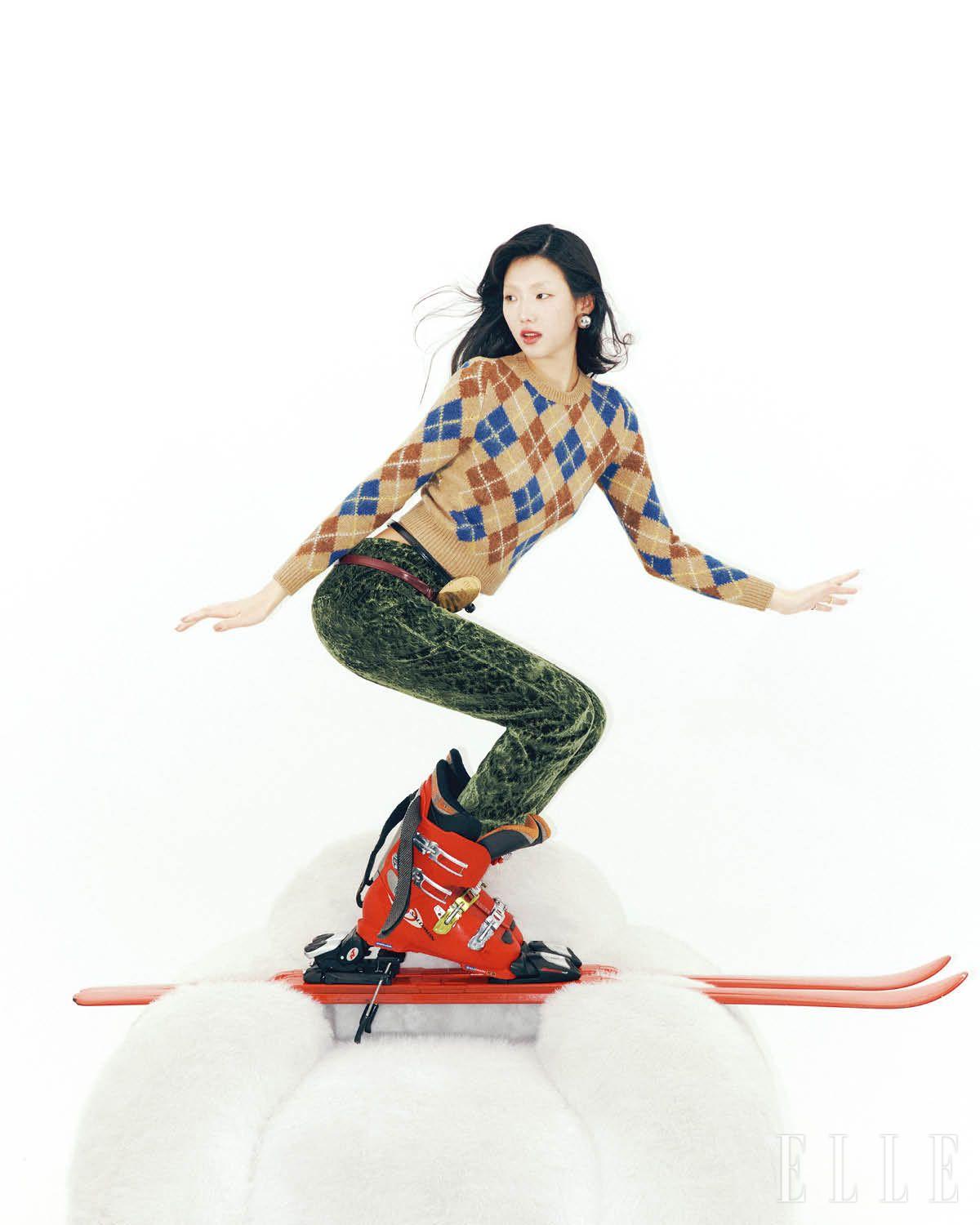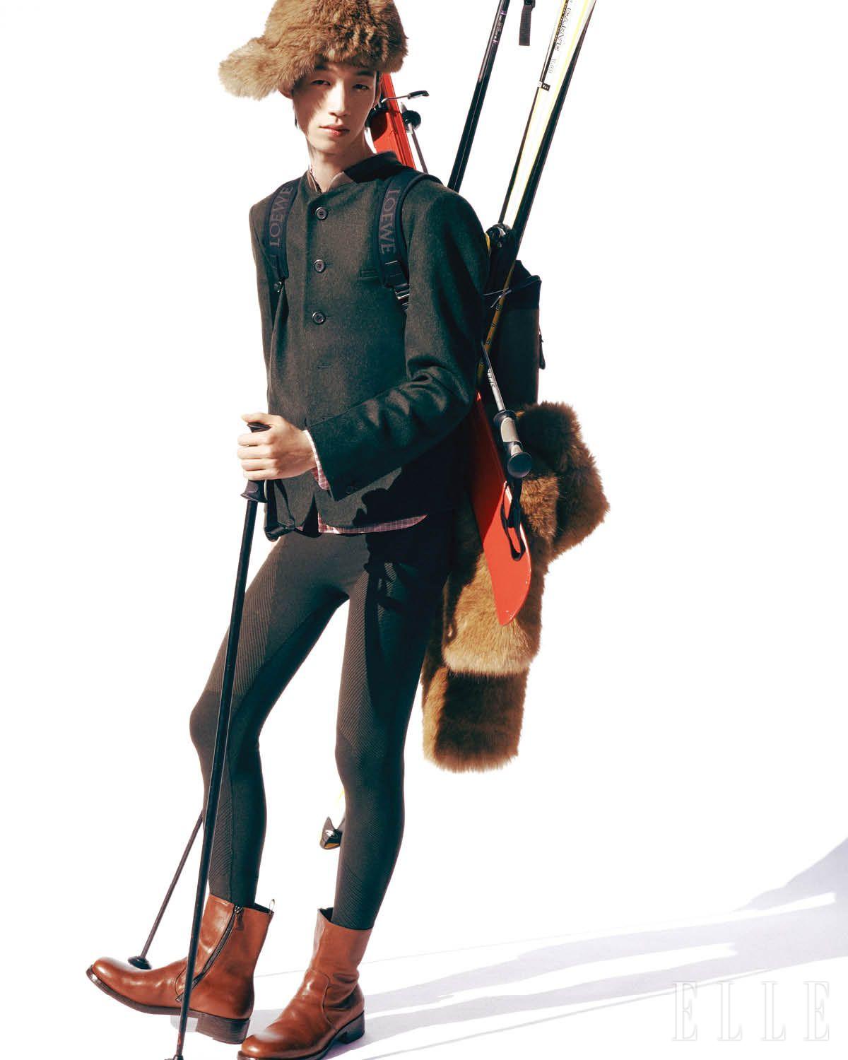 글러브를 부착한 재킷은 가격 미정, Moschino. 로고 디테일의 니트 톱은 가격 미정, Celine. 스키 점프수트는 가격 미정, H&M. 실크 보타이는 가격 미정, Kiton.