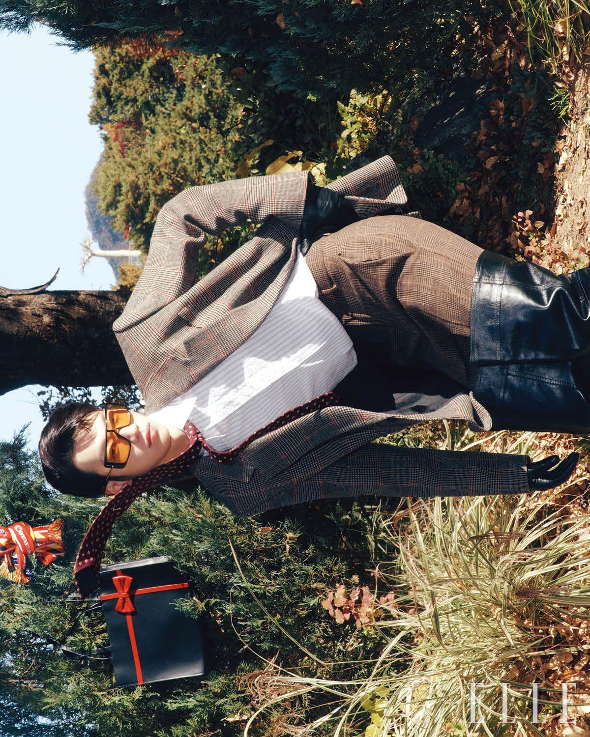 체크 패턴 재킷과 팬츠, 스트라이프 셔츠, 도트 패턴의 타이, 레더 하이 부츠, 글러브는 가격 미정, 모두 Saint Laurent by Anthony Vaccarello. 틴티드 고글선글라스는 85만원대, McQueen. 나무에 장식된 머플러는 18만원, Comme des Garçons Shirt. 리본 장식 토트백은 가격 미정, Ernest W. Baker.