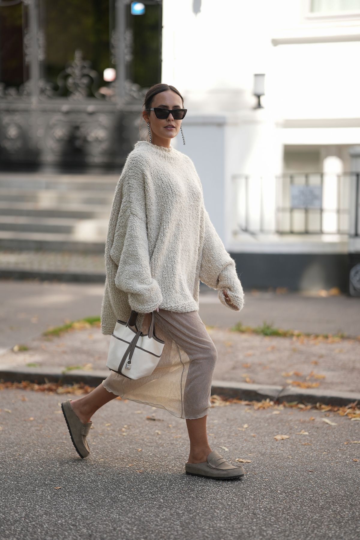 겨울에 화려함과 편안함을 모두 잡고 싶다면, 가장 먼저 톤온톤의 뉴트럴 컬러를 다루는 방식에 집중해보세요. 전체적인 실루엣을 단번에 여유롭게 만들어주는 오버사이즈 크림 니트 스웨터는 피부 위에 부드럽게 떨어지며 자연스러운 우아함을 자아냅니다. 여기에 런웨이에 오를 법한 스타일리시한 메시 스커트 하나만 더해주면 소재의 대비가 극적으로 살아나고, 걸을 때마다 은근한 움직임이 생겨 스타일 전체가 살아나죠. 버킷 백과 광택이 은은하게 도는 드롭 이어링, 룩에 강약을 주는 블랙 아웃 선글라스까지 더하면 콰이어트 럭셔리의 핵심이 완성됩니다. 마지막으로 버켄스탁 네이플스의 매끈한 가죽 텍스처가 전체적인 룩을 안정감 있게 잡아주며, 미니멀하면서도 현대적인 균형을 빚어내죠.