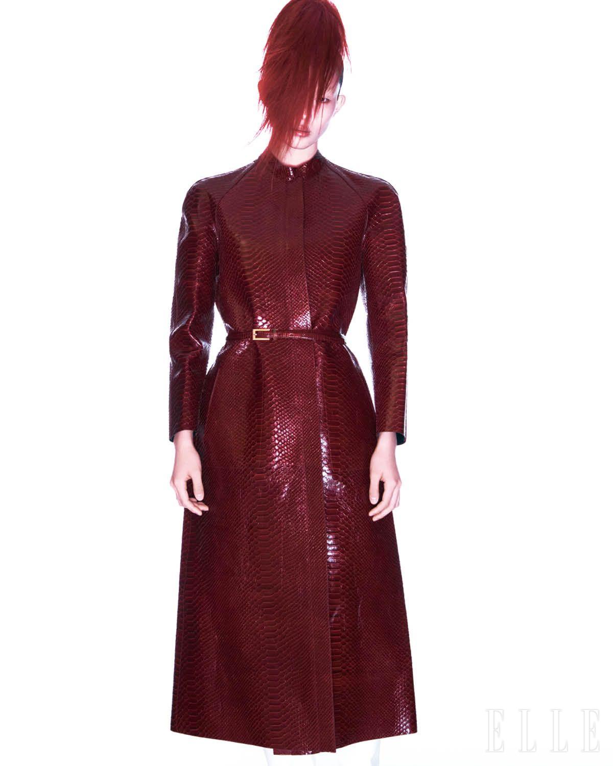 가죽에 악어 패턴을 프린트한 코트와 벨트는 가격 미정, 모두 Tom Ford. 부츠는 가격 미정, Balenciaga.