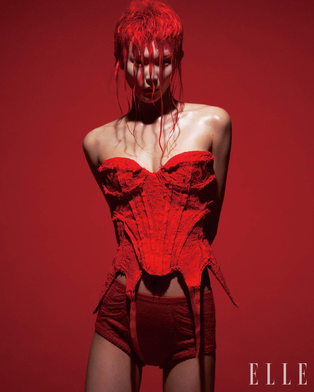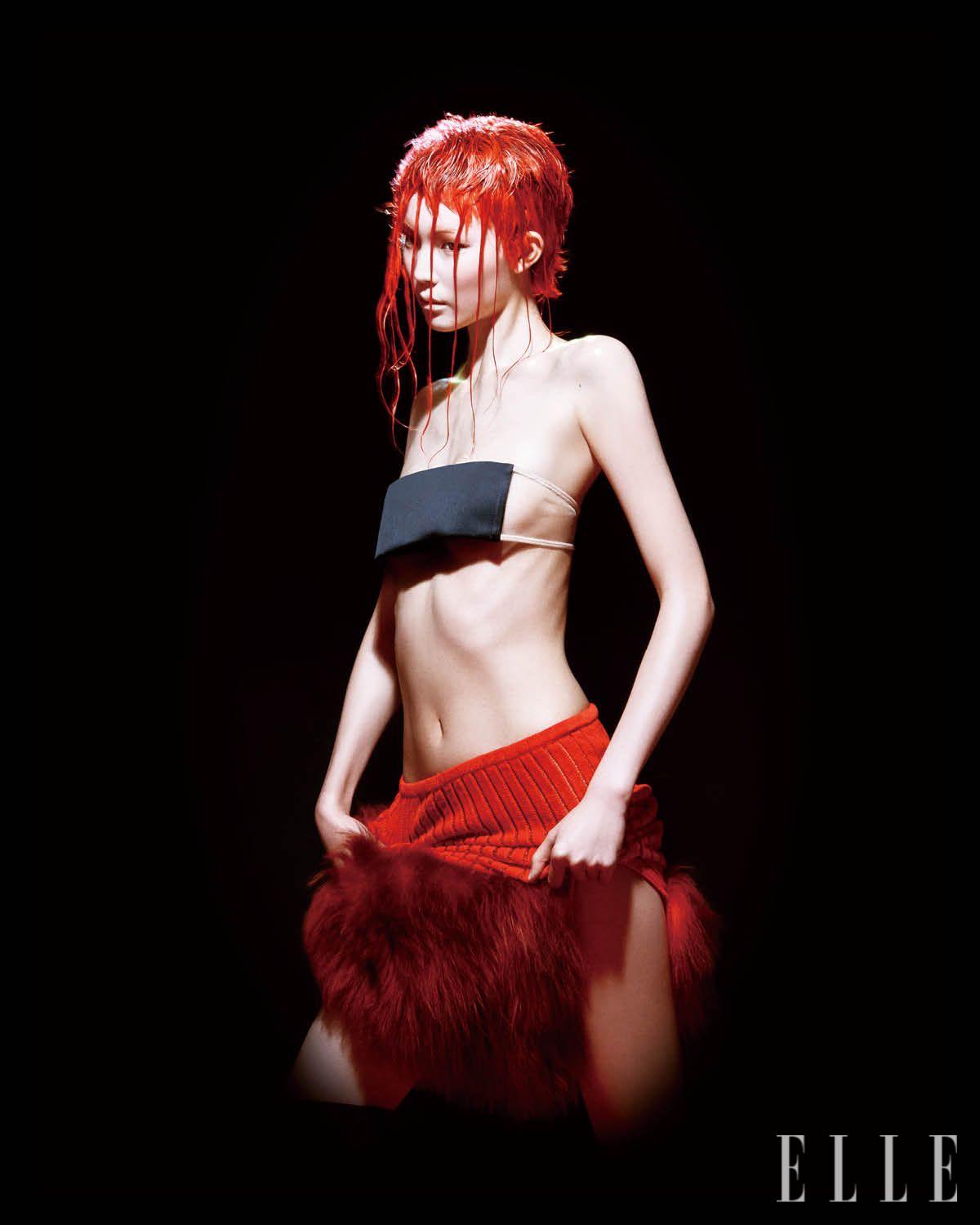 뷔스티에 드레스는 9백55만원, Alex Perry by Kayla Bennet. 레드 프레임의 선글라스는 52만원, Gentle Monster. 장갑은 에디터 소장품.