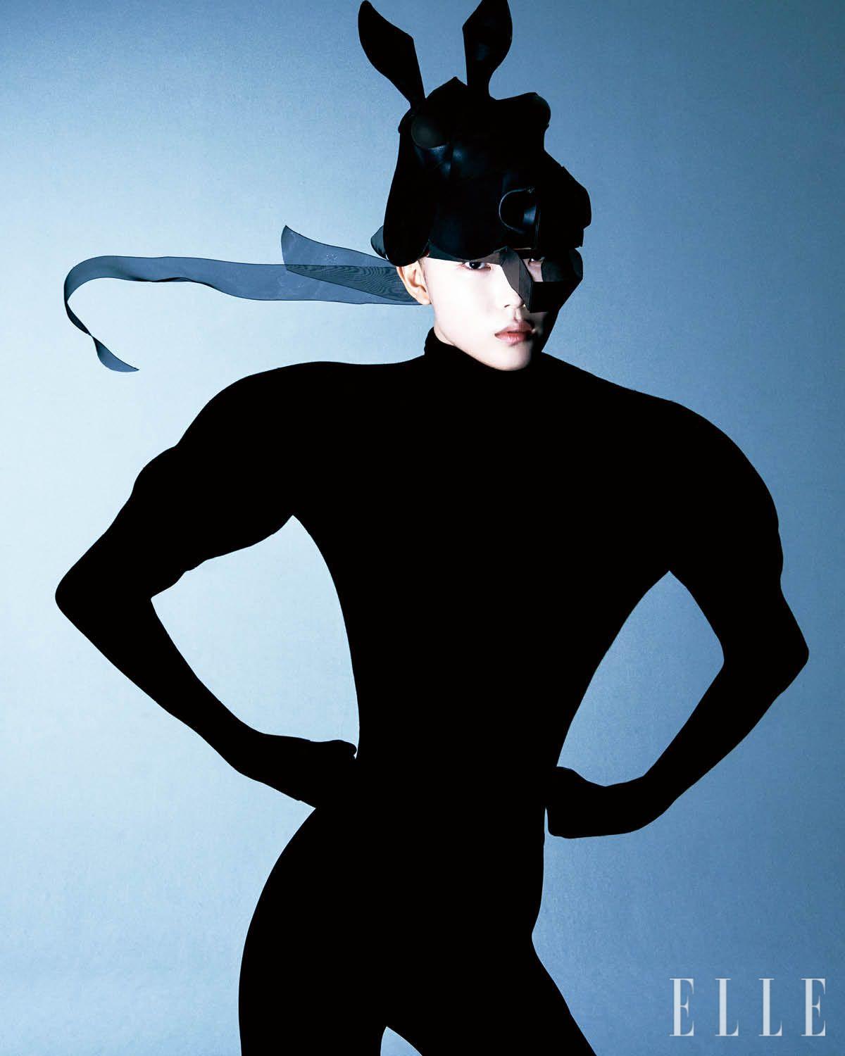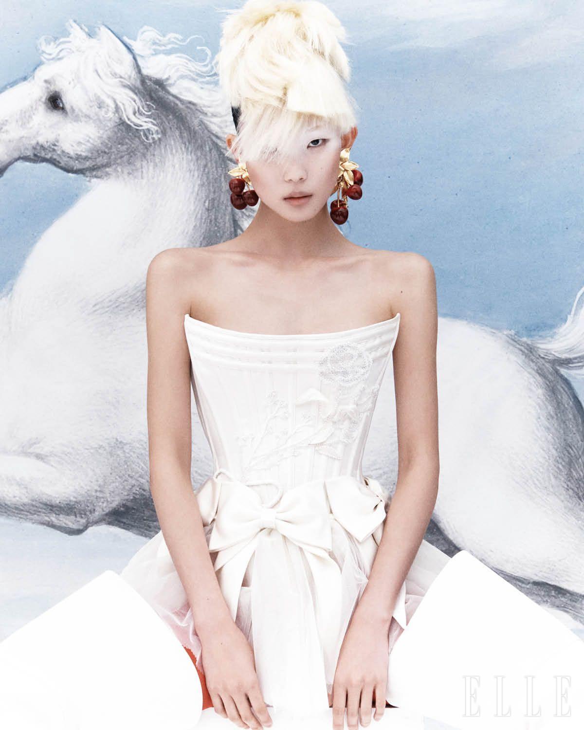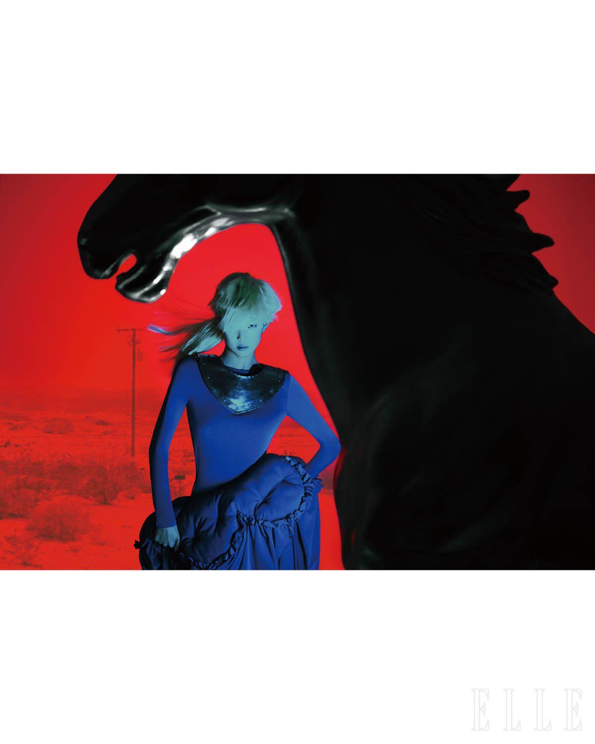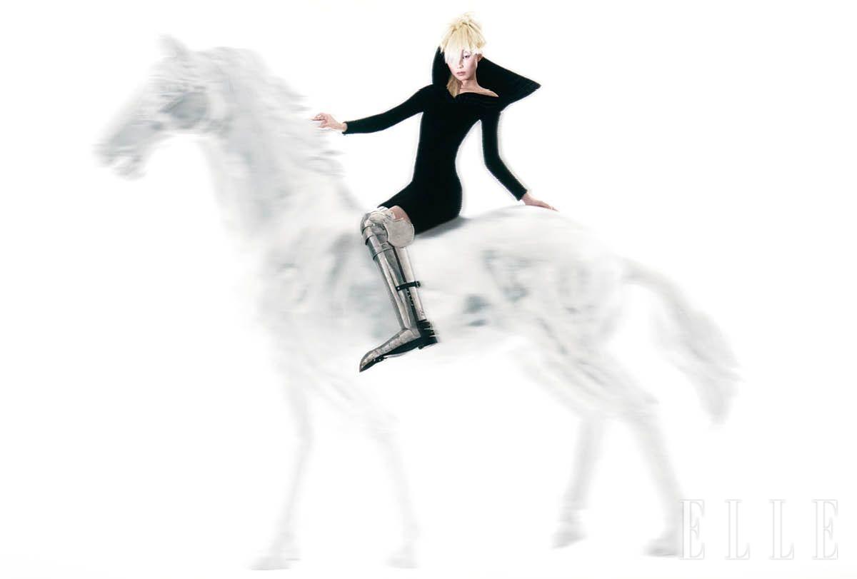 터틀넥 보디수트는 가격 미정, Loro Piana. 말 모티프의 헤드피스와 스타킹은 에디터 소장품.